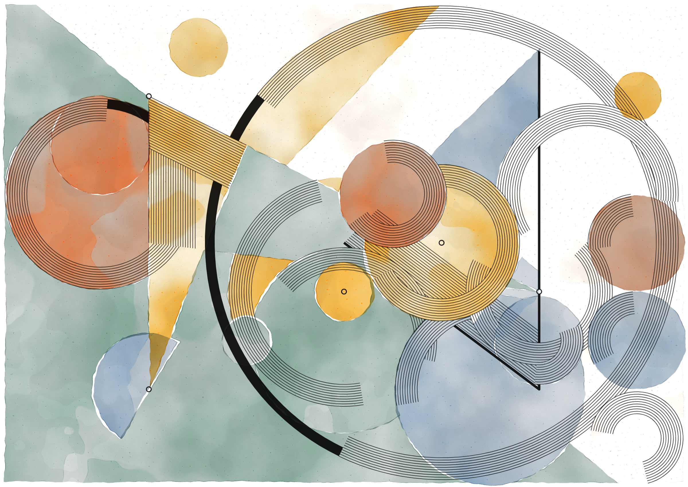 *Inprecision* is exploring the tension between the precision offered by computers and the imperfections inherent in classic art production approaches. The generative system is based on circles and triangles, perfectly aligned with each other and placed on a grid, but rendered with a technique inspired by the look of water color giving a high degree of imperfection in the rendered output. The precision of the underlying system is then again accentuated by a layer of hyper precise line drawings, outlining the used geometries and providing a scaffold for the underlying colors.