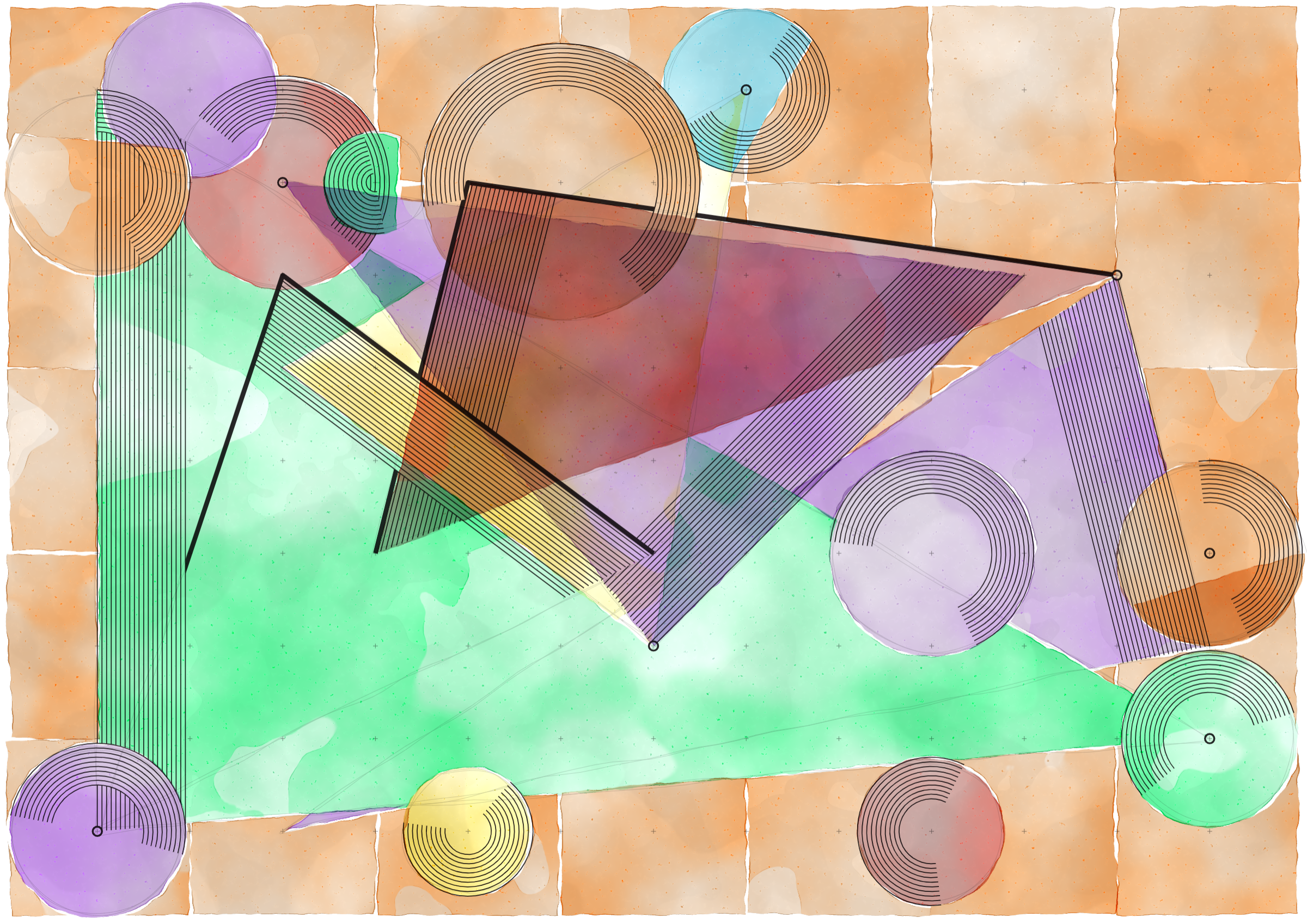 *Inprecision* is exploring the tension between the precision offered by computers and the imperfections inherent in classic art production approaches. The generative system is based on circles and triangles, perfectly aligned with each other and placed on a grid, but rendered with a technique inspired by the look of water color giving a high degree of imperfection in the rendered output. The precision of the underlying system is then again accentuated by a layer of hyper precise line drawings, outlining the used geometries and providing a scaffold for the underlying colors.