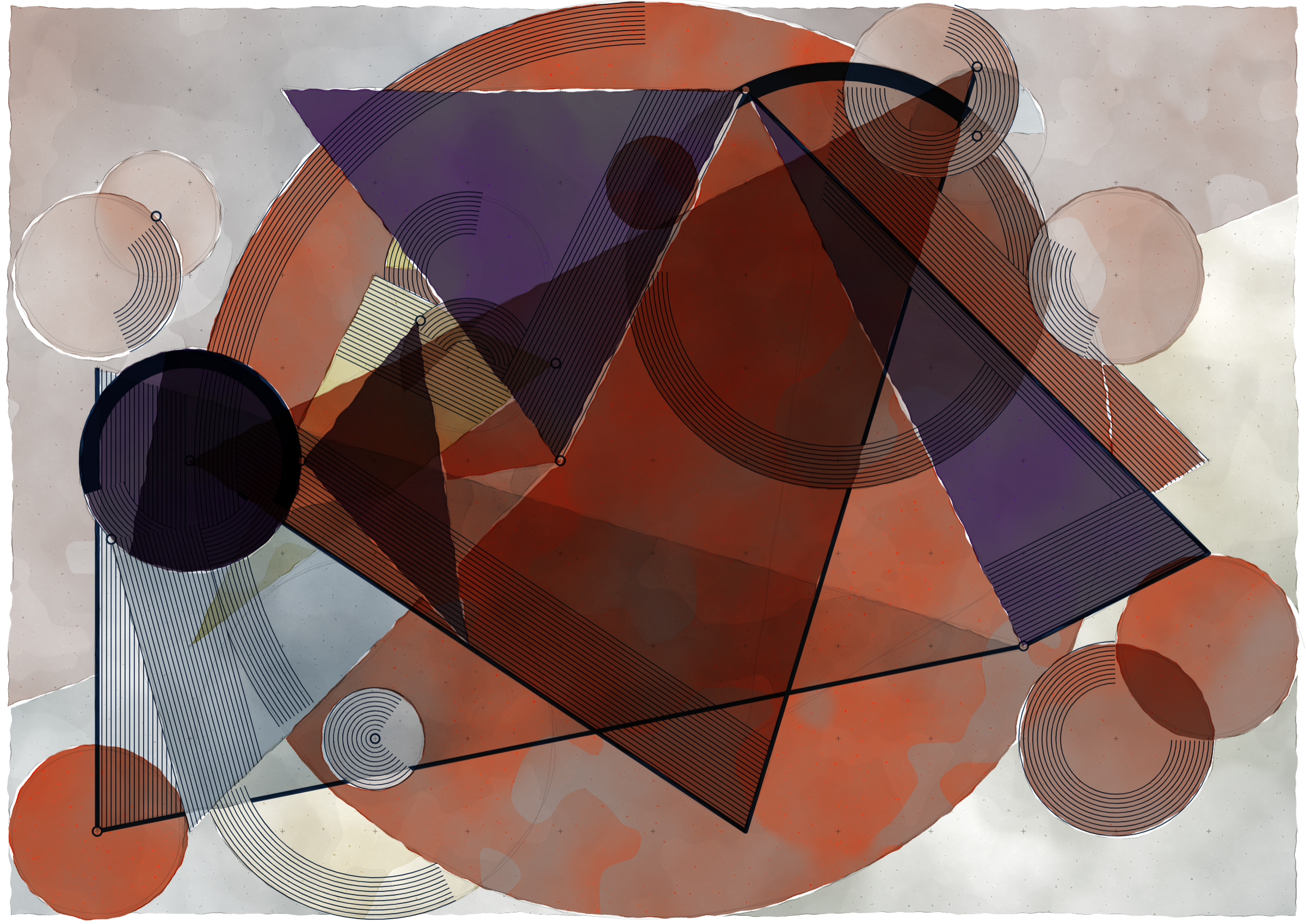 *Inprecision* is exploring the tension between the precision offered by computers and the imperfections inherent in classic art production approaches. The generative system is based on circles and triangles, perfectly aligned with each other and placed on a grid, but rendered with a technique inspired by the look of water color giving a high degree of imperfection in the rendered output. The precision of the underlying system is then again accentuated by a layer of hyper precise line drawings, outlining the used geometries and providing a scaffold for the underlying colors.