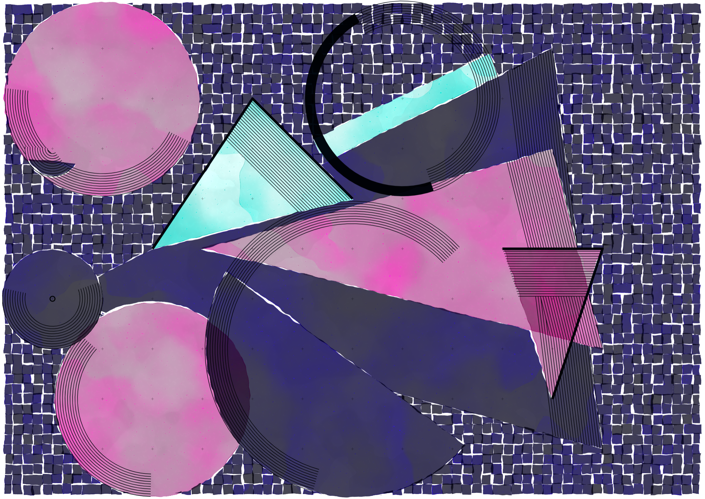 *Inprecision* is exploring the tension between the precision offered by computers and the imperfections inherent in classic art production approaches. The generative system is based on circles and triangles, perfectly aligned with each other and placed on a grid, but rendered with a technique inspired by the look of water color giving a high degree of imperfection in the rendered output. The precision of the underlying system is then again accentuated by a layer of hyper precise line drawings, outlining the used geometries and providing a scaffold for the underlying colors.