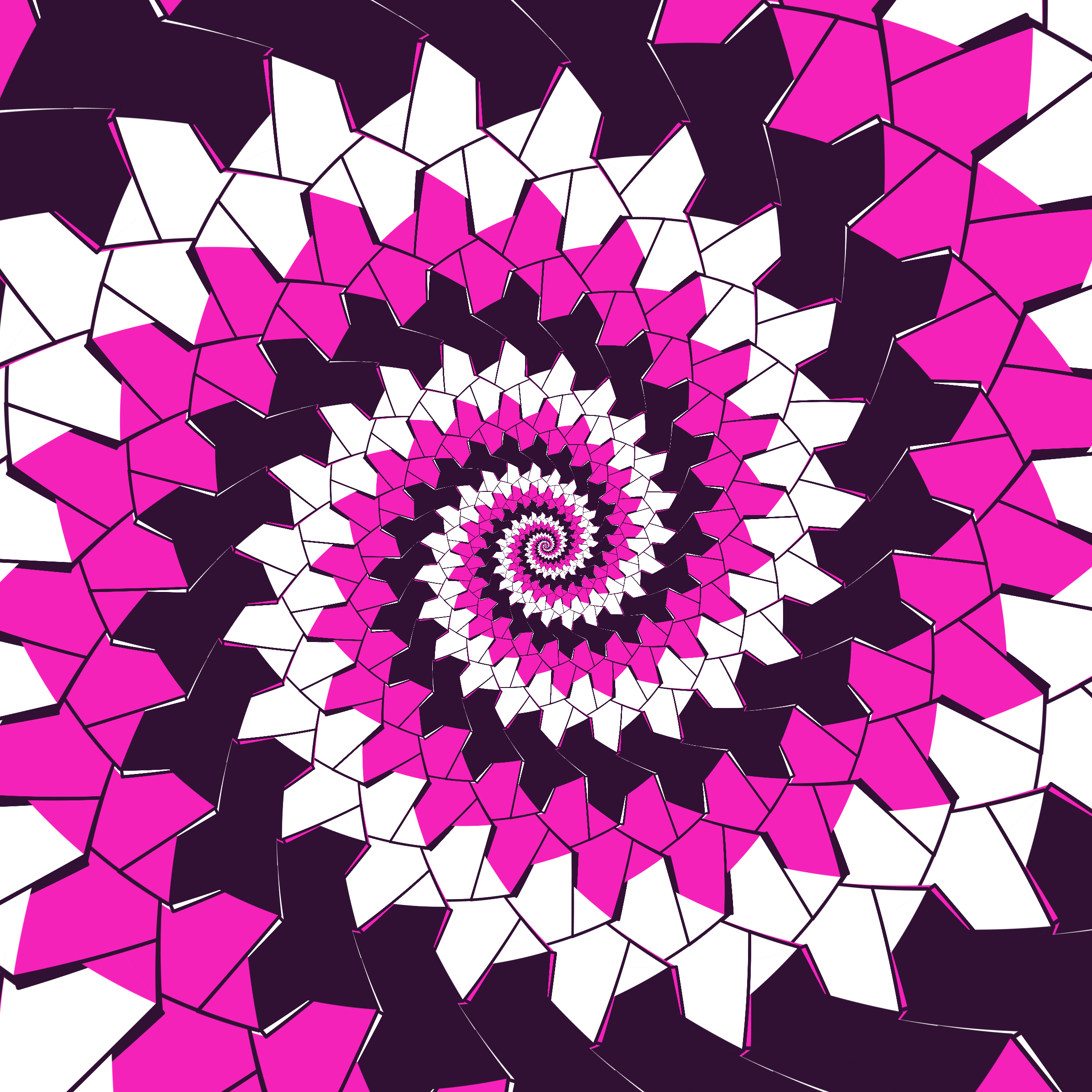 Escher-style tiling of a plane, gone wrong. Each image spins hash-driven colors, shapes, and symmetries into infinity. Fly through the spiral as it morphs between beauty and madness. Keys: F = Fly through/back, D = Distort on/off, Esc = Stop, S = Save image.