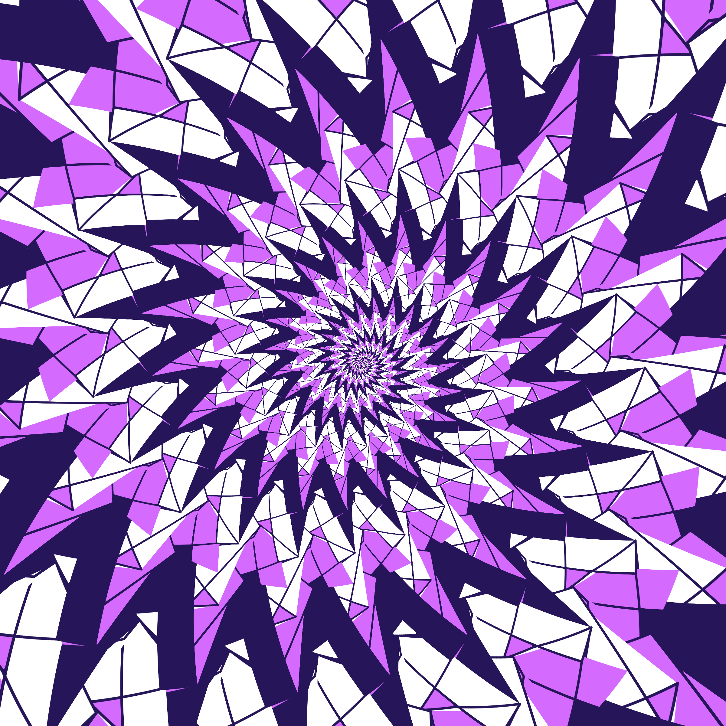 Escher-style tiling of a plane, gone wrong. Each image spins hash-driven colors, shapes, and symmetries into infinity. Fly through the spiral as it morphs between beauty and madness. Keys: F = Fly through/back, D = Distort on/off, Esc = Stop, S = Save image.