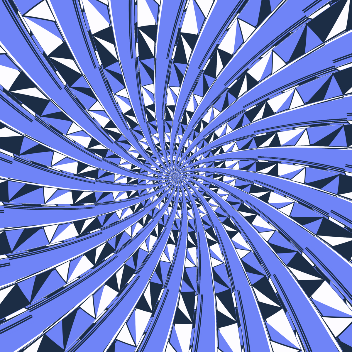 Escher-style tiling of a plane, gone wrong. Each image spins hash-driven colors, shapes, and symmetries into infinity. Fly through the spiral as it morphs between beauty and madness. Keys: F = Fly through/back, D = Distort on/off, Esc = Stop, S = Save image.