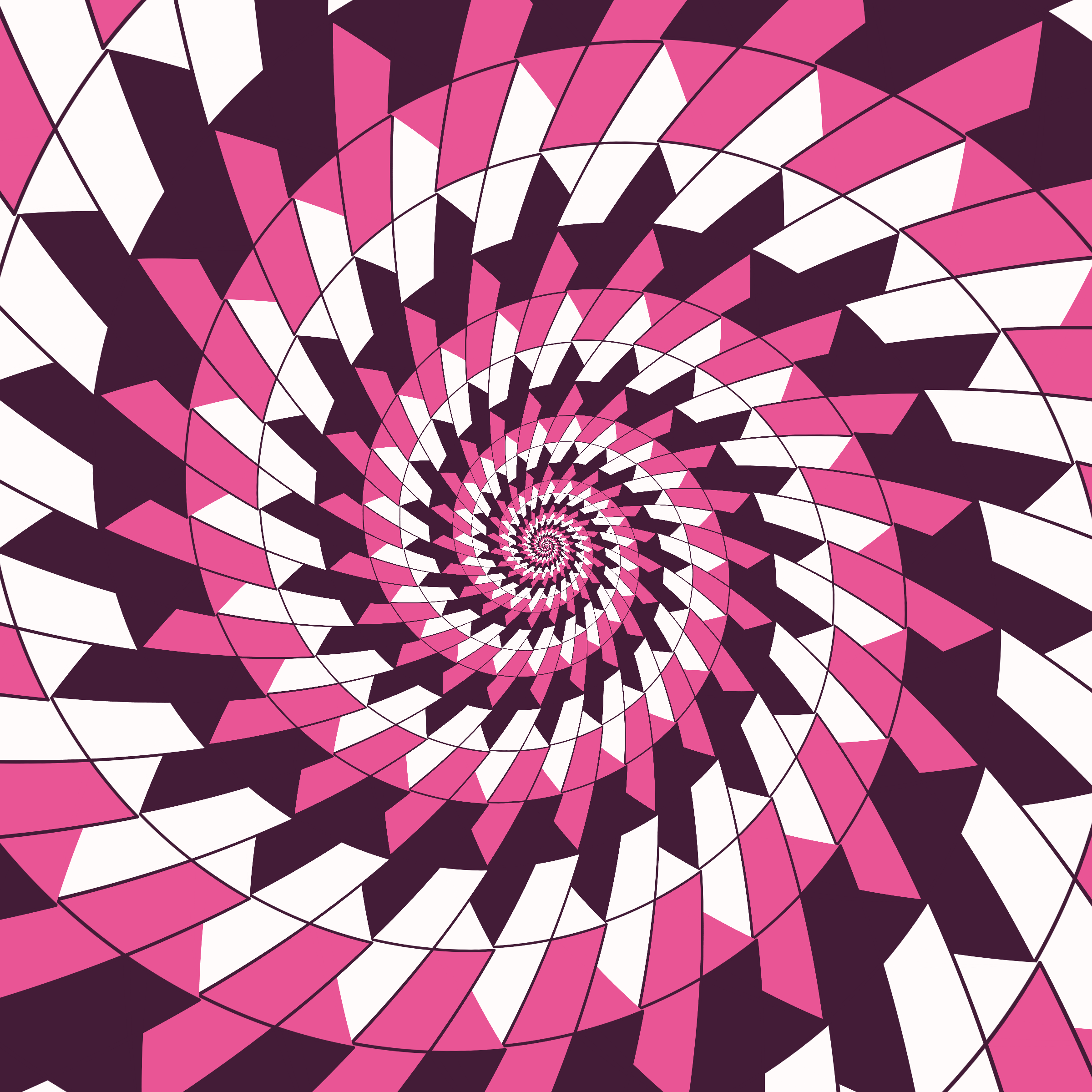 Escher-style tiling of a plane, gone wrong. Each image spins hash-driven colors, shapes, and symmetries into infinity. Fly through the spiral as it morphs between beauty and madness. Keys: F = Fly through/back, D = Distort on/off, Esc = Stop, S = Save image.