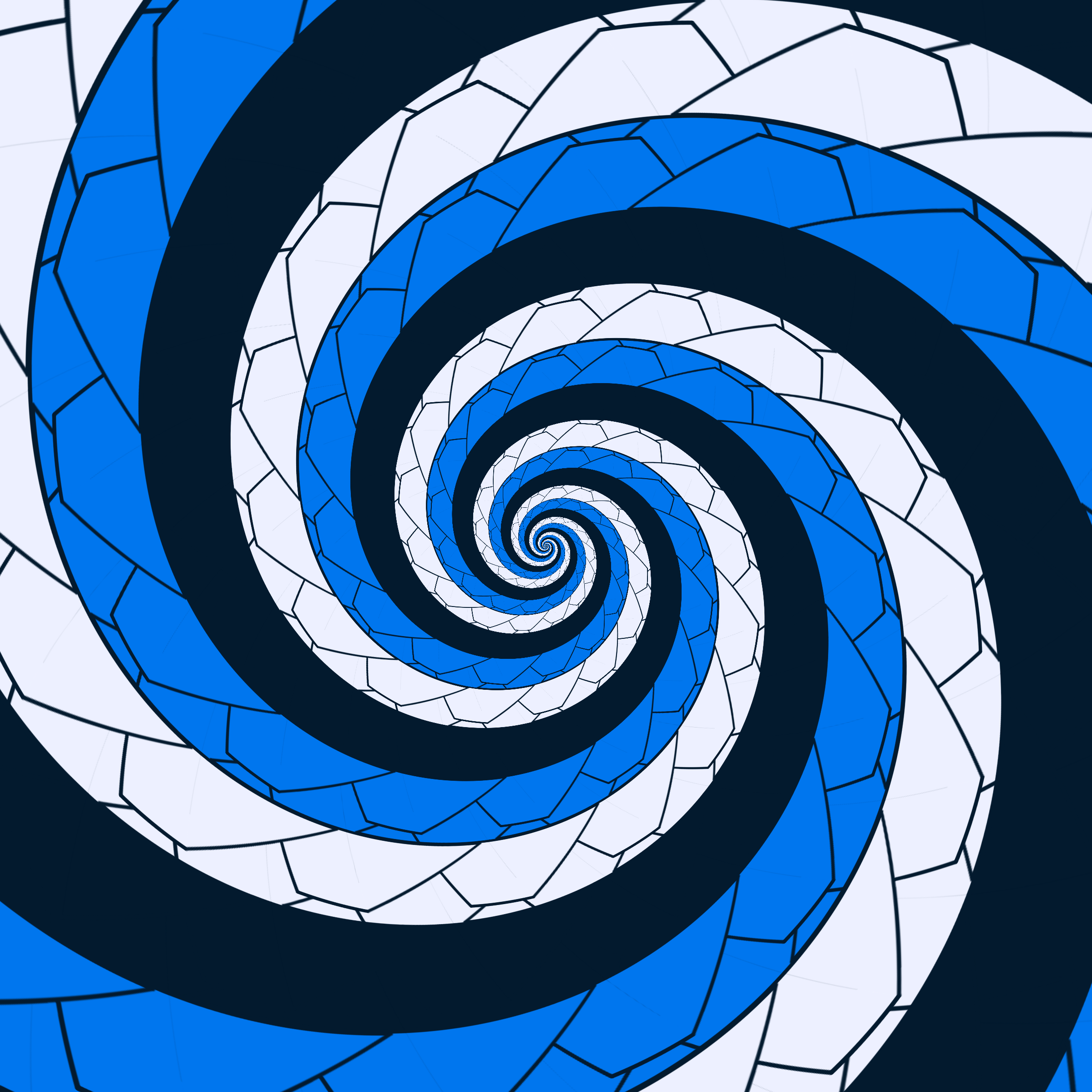 Escher-style tiling of a plane, gone wrong. Each image spins hash-driven colors, shapes, and symmetries into infinity. Fly through the spiral as it morphs between beauty and madness. Keys: F = Fly through/back, D = Distort on/off, Esc = Stop, S = Save image.