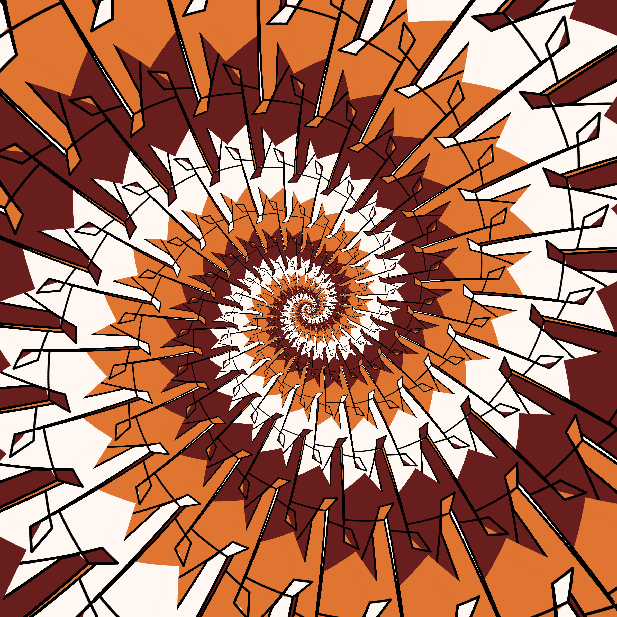 Escher-style tiling of a plane, gone wrong. Each image spins hash-driven colors, shapes, and symmetries into infinity. Fly through the spiral as it morphs between beauty and madness. Keys: F = Fly through/back, D = Distort on/off, Esc = Stop, S = Save image.