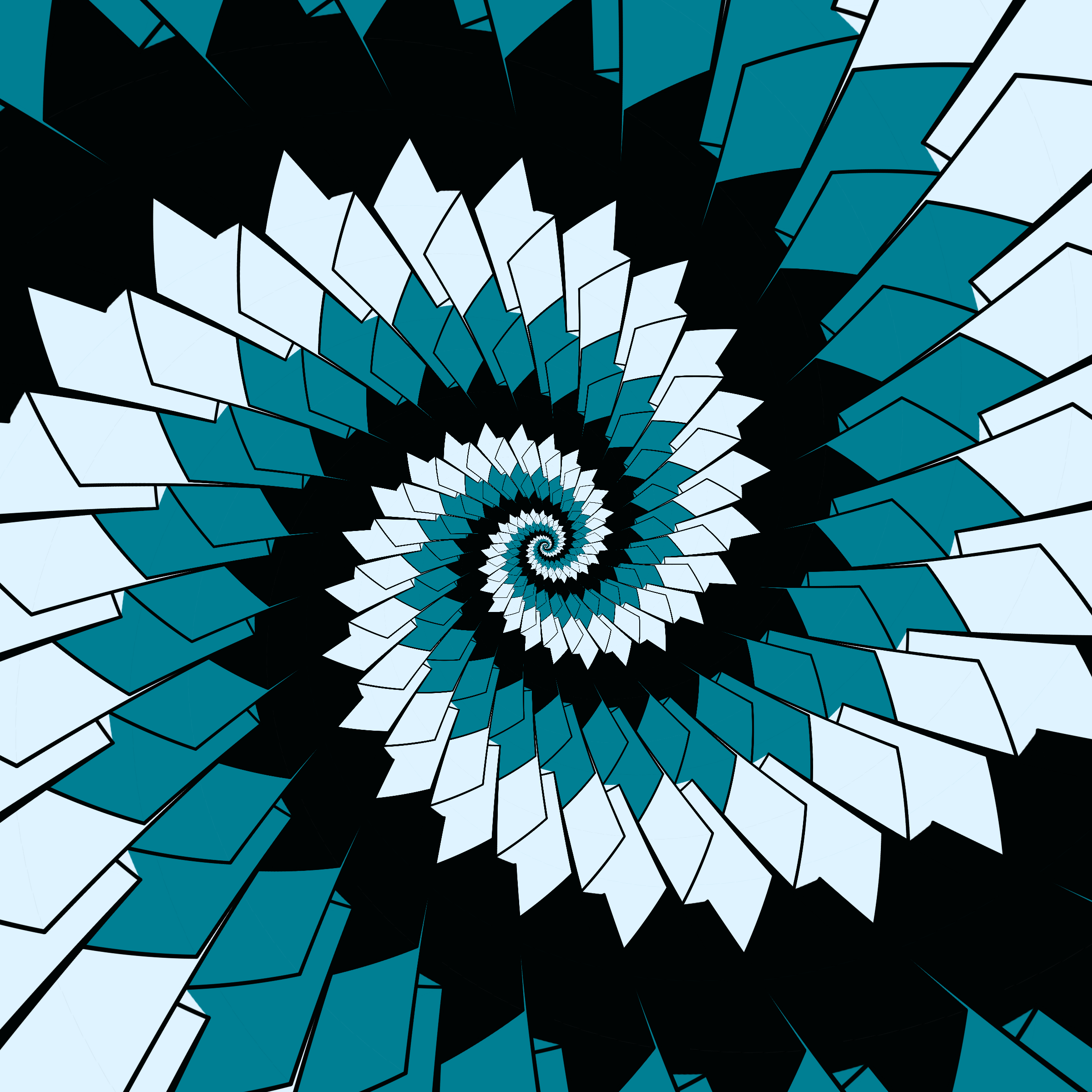 Escher-style tiling of a plane, gone wrong. Each image spins hash-driven colors, shapes, and symmetries into infinity. Fly through the spiral as it morphs between beauty and madness. Keys: F = Fly through/back, D = Distort on/off, Esc = Stop, S = Save image.