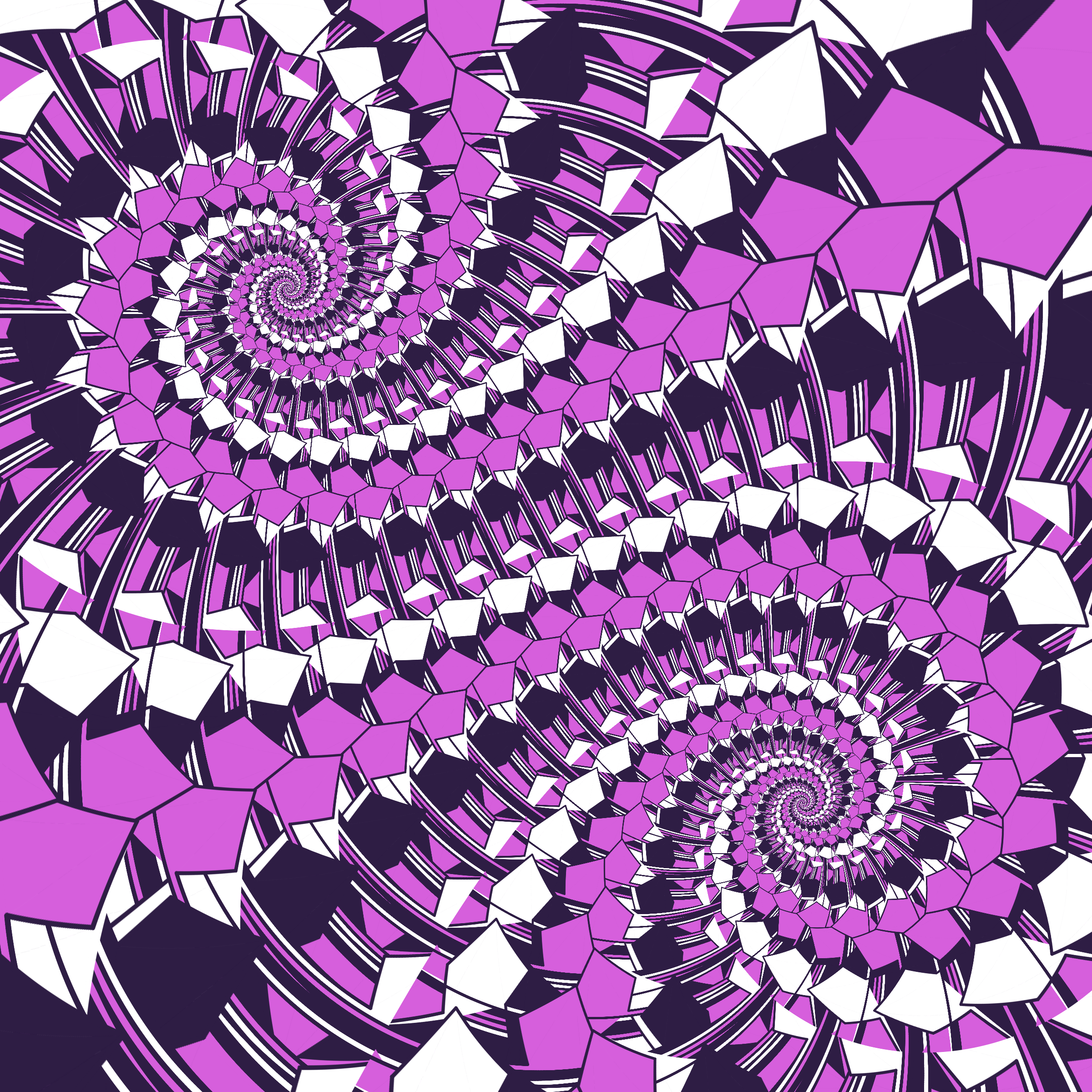 Escher-style tiling of a plane, gone wrong. Each image spins hash-driven colors, shapes, and symmetries into infinity. Fly through the spiral as it morphs between beauty and madness. Keys: F = Fly through/back, D = Distort on/off, Esc = Stop, S = Save image.