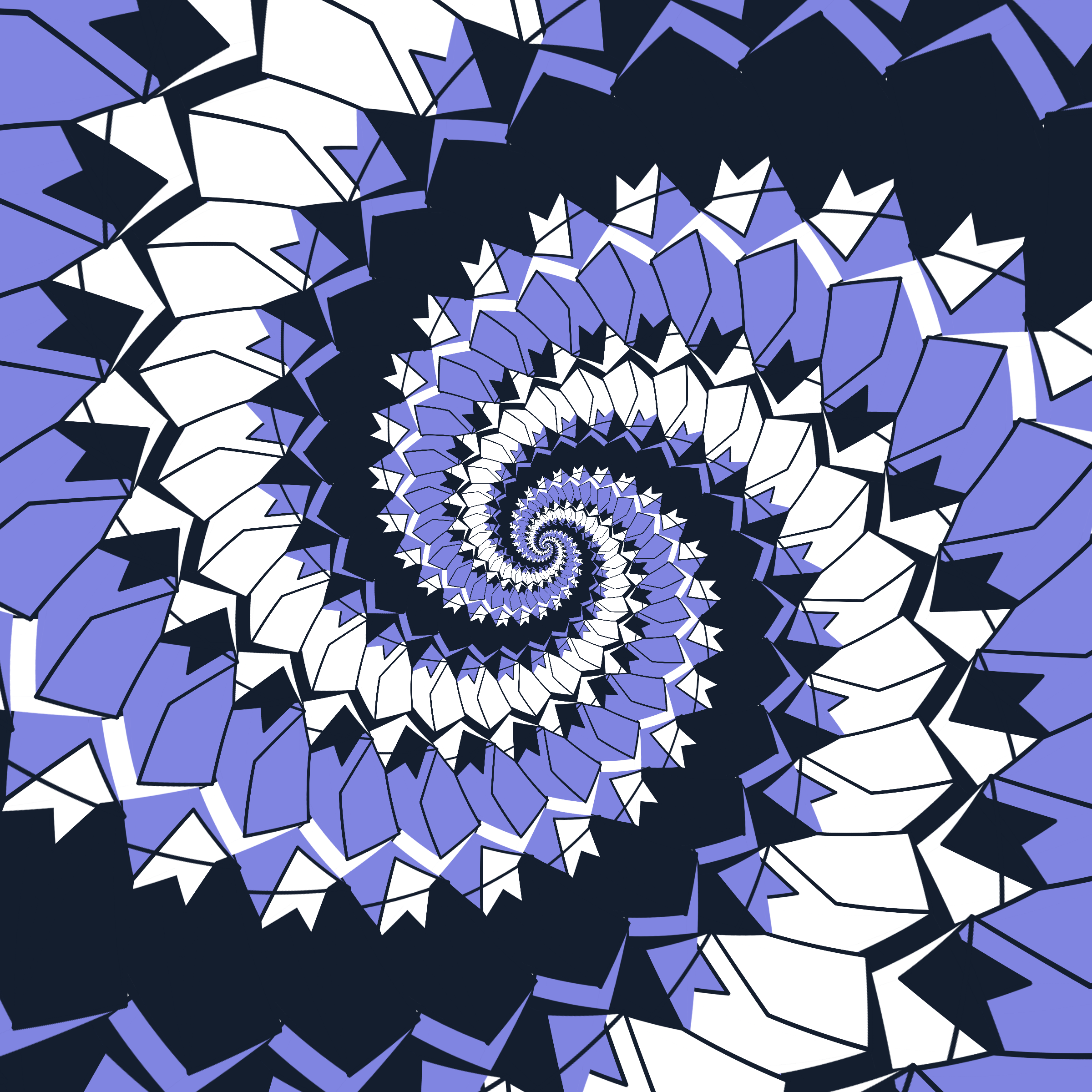 Escher-style tiling of a plane, gone wrong. Each image spins hash-driven colors, shapes, and symmetries into infinity. Fly through the spiral as it morphs between beauty and madness. Keys: F = Fly through/back, D = Distort on/off, Esc = Stop, S = Save image.