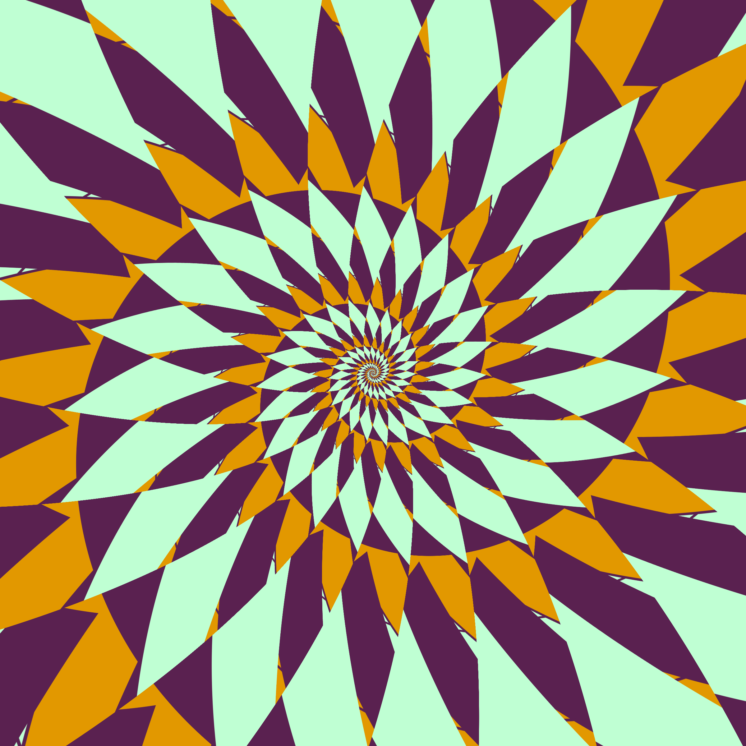 Escher-style tiling of a plane, gone wrong. Each image spins hash-driven colors, shapes, and symmetries into infinity. Fly through the spiral as it morphs between beauty and madness. Keys: F = Fly through/back, D = Distort on/off, Esc = Stop, S = Save image.