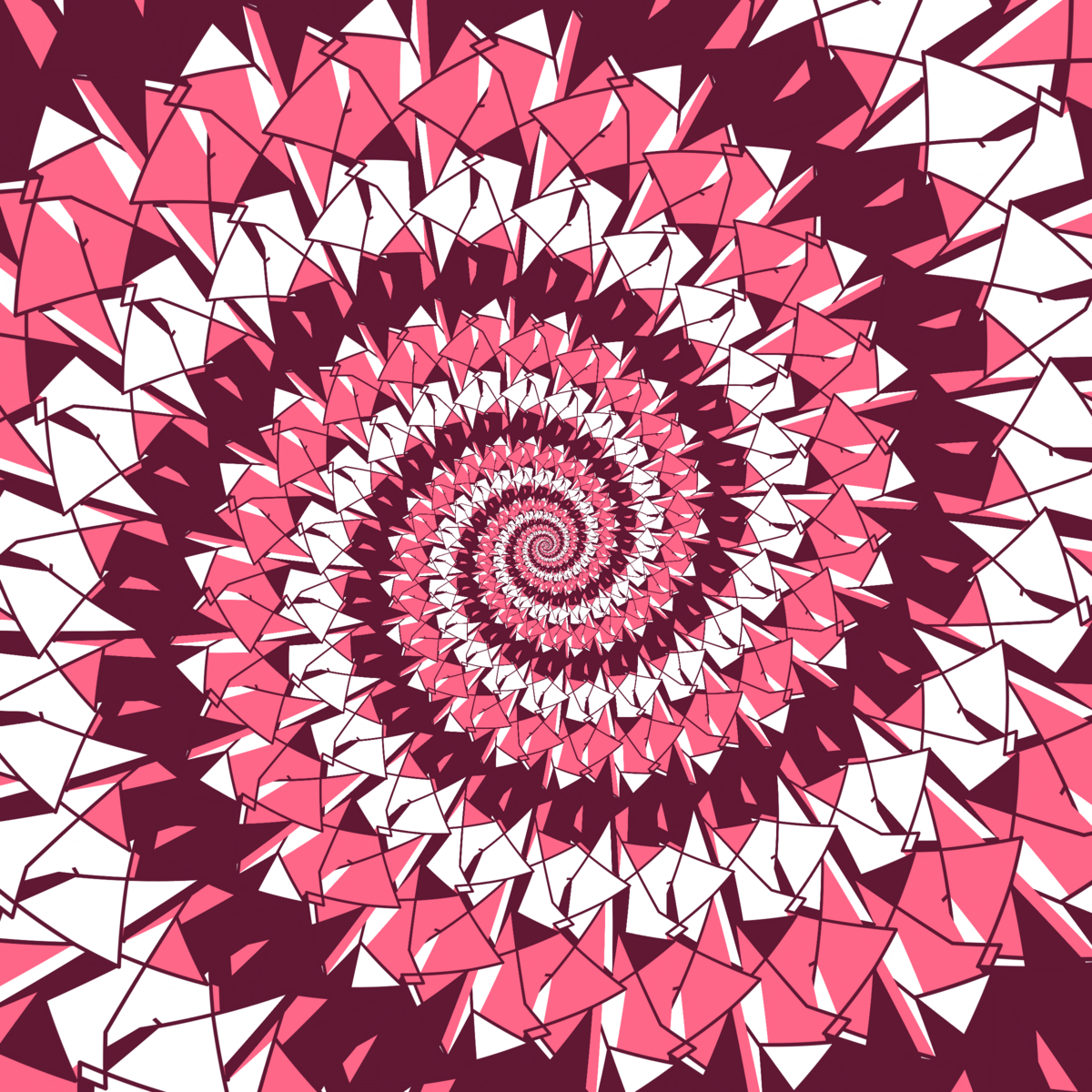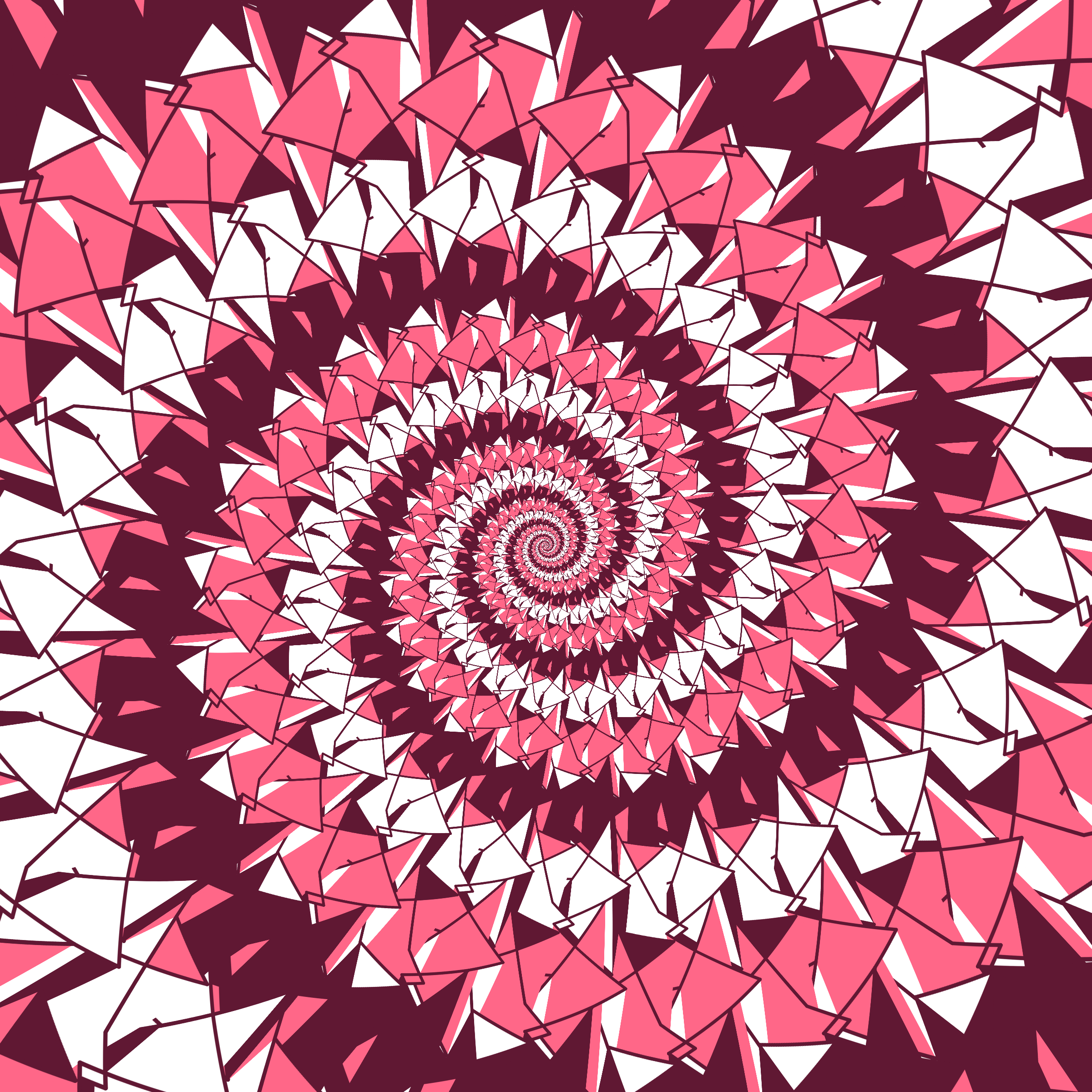 Escher-style tiling of a plane, gone wrong. Each image spins hash-driven colors, shapes, and symmetries into infinity. Fly through the spiral as it morphs between beauty and madness. Keys: F = Fly through/back, D = Distort on/off, Esc = Stop, S = Save image.