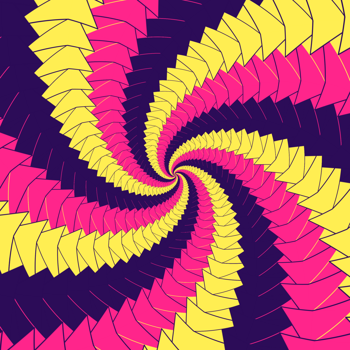 Escher-style tiling of a plane, gone wrong. Each image spins hash-driven colors, shapes, and symmetries into infinity. Fly through the spiral as it morphs between beauty and madness. Keys: F = Fly through/back, D = Distort on/off, Esc = Stop, S = Save image.