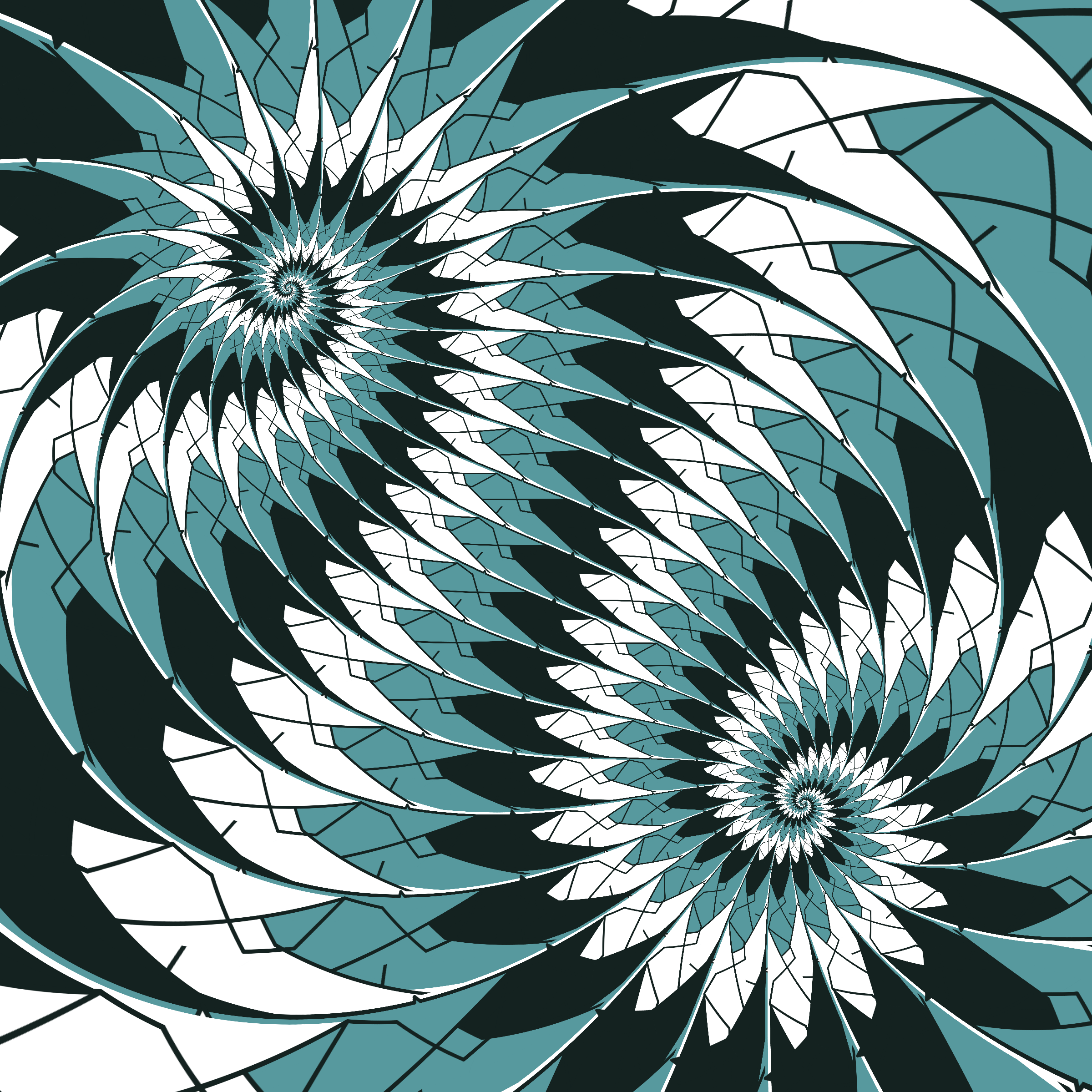 Escher-style tiling of a plane, gone wrong. Each image spins hash-driven colors, shapes, and symmetries into infinity. Fly through the spiral as it morphs between beauty and madness. Keys: F = Fly through/back, D = Distort on/off, Esc = Stop, S = Save image.