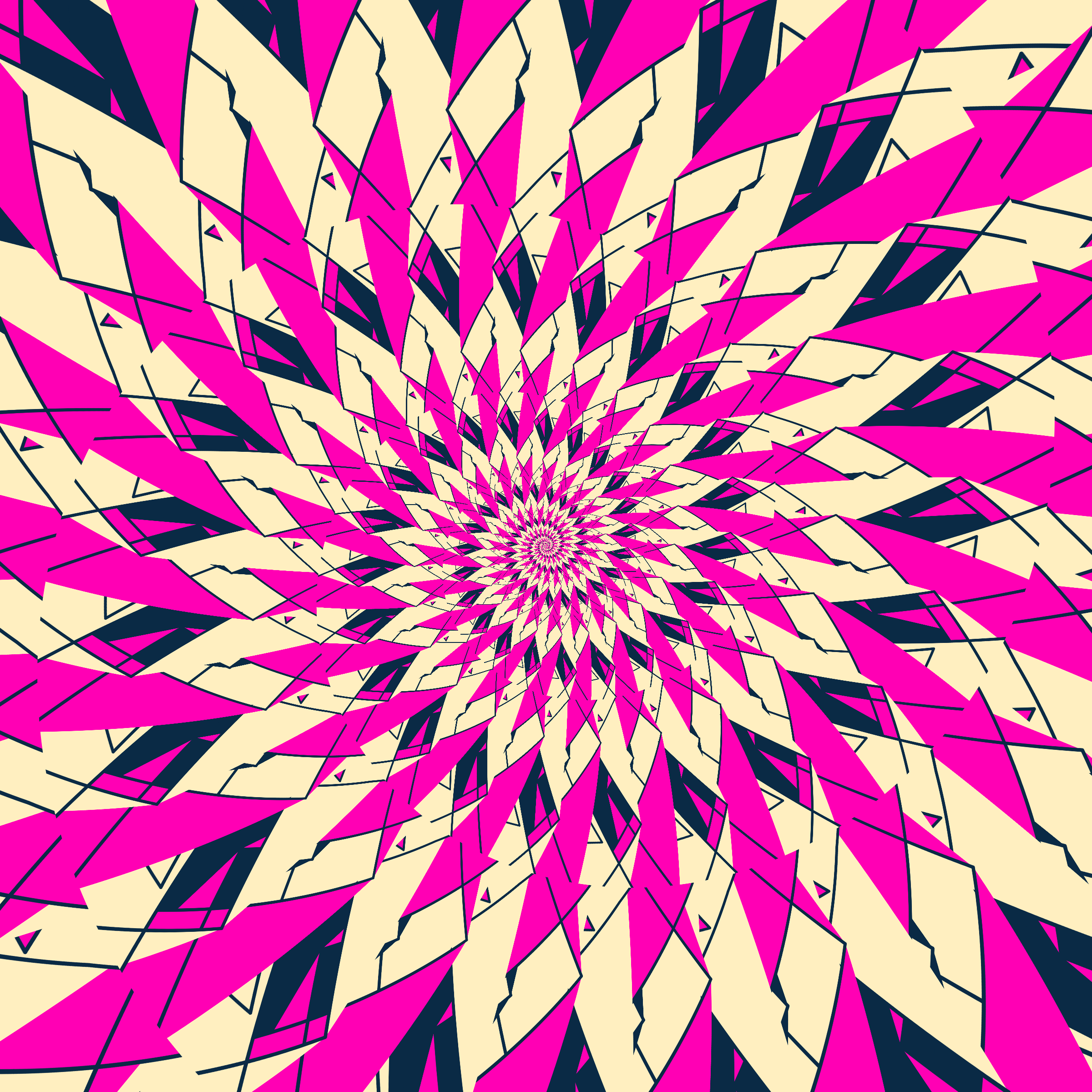 Escher-style tiling of a plane, gone wrong. Each image spins hash-driven colors, shapes, and symmetries into infinity. Fly through the spiral as it morphs between beauty and madness. Keys: F = Fly through/back, D = Distort on/off, Esc = Stop, S = Save image.