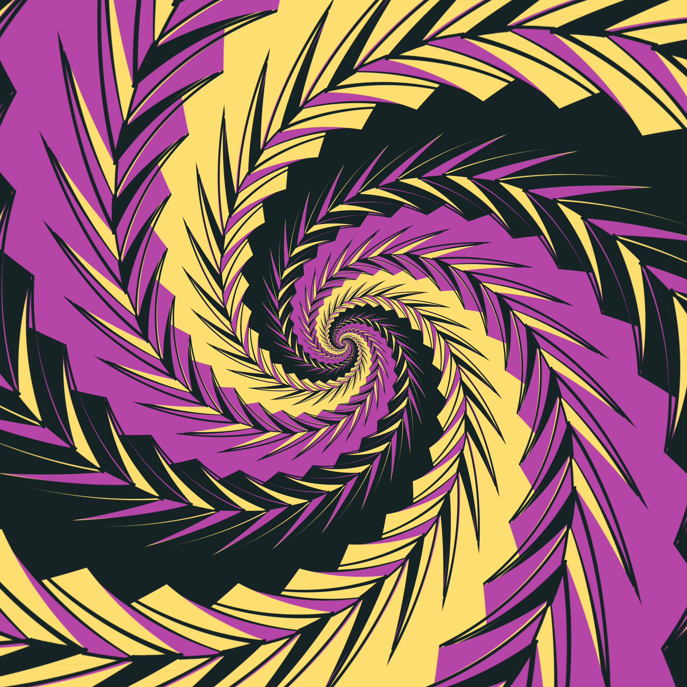 Escher-style tiling of a plane, gone wrong. Each image spins hash-driven colors, shapes, and symmetries into infinity. Fly through the spiral as it morphs between beauty and madness. Keys: F = Fly through/back, D = Distort on/off, Esc = Stop, S = Save image.