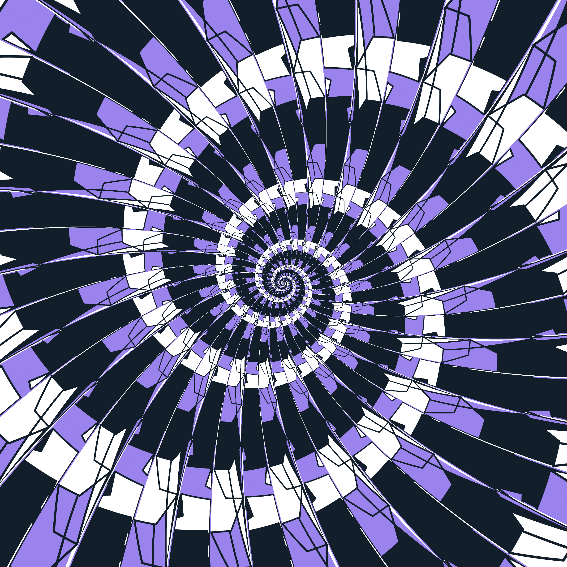 Escher-style tiling of a plane, gone wrong. Each image spins hash-driven colors, shapes, and symmetries into infinity. Fly through the spiral as it morphs between beauty and madness. Keys: F = Fly through/back, D = Distort on/off, Esc = Stop, S = Save image.