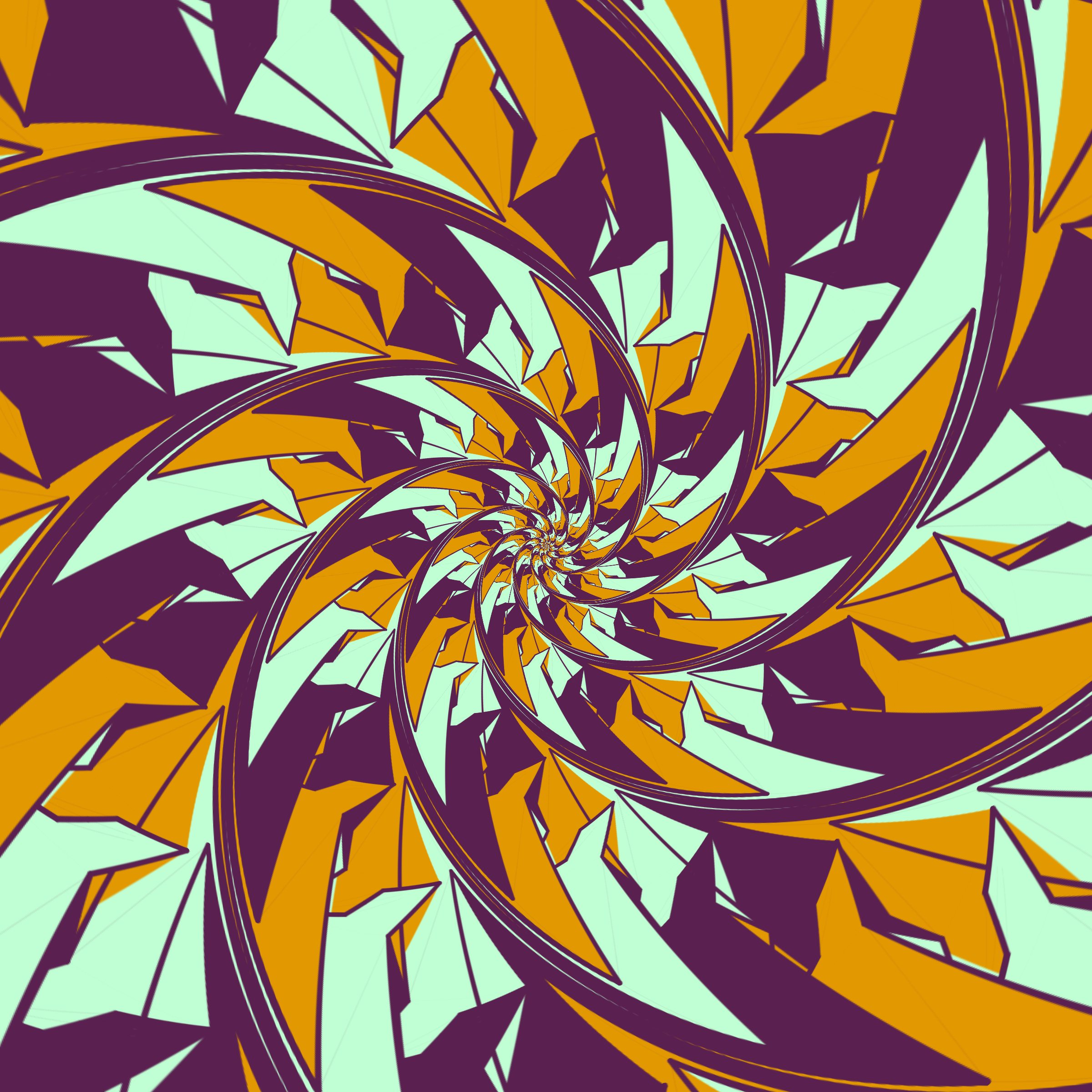 Escher-style tiling of a plane, gone wrong. Each image spins hash-driven colors, shapes, and symmetries into infinity. Fly through the spiral as it morphs between beauty and madness. Keys: F = Fly through/back, D = Distort on/off, Esc = Stop, S = Save image.