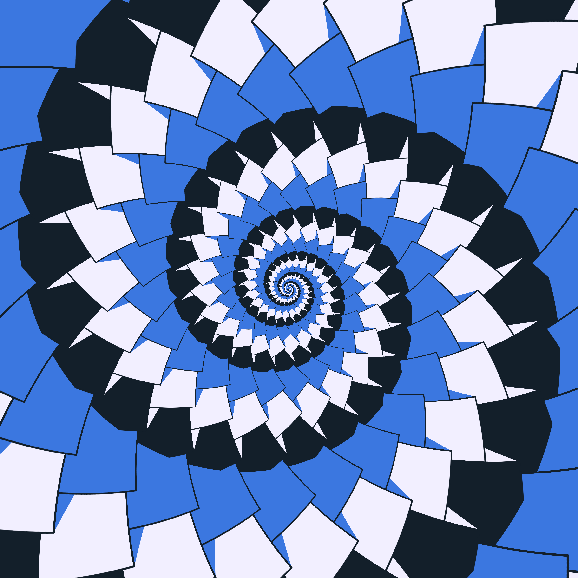 Escher-style tiling of a plane, gone wrong. Each image spins hash-driven colors, shapes, and symmetries into infinity. Fly through the spiral as it morphs between beauty and madness. Keys: F = Fly through/back, D = Distort on/off, Esc = Stop, S = Save image.