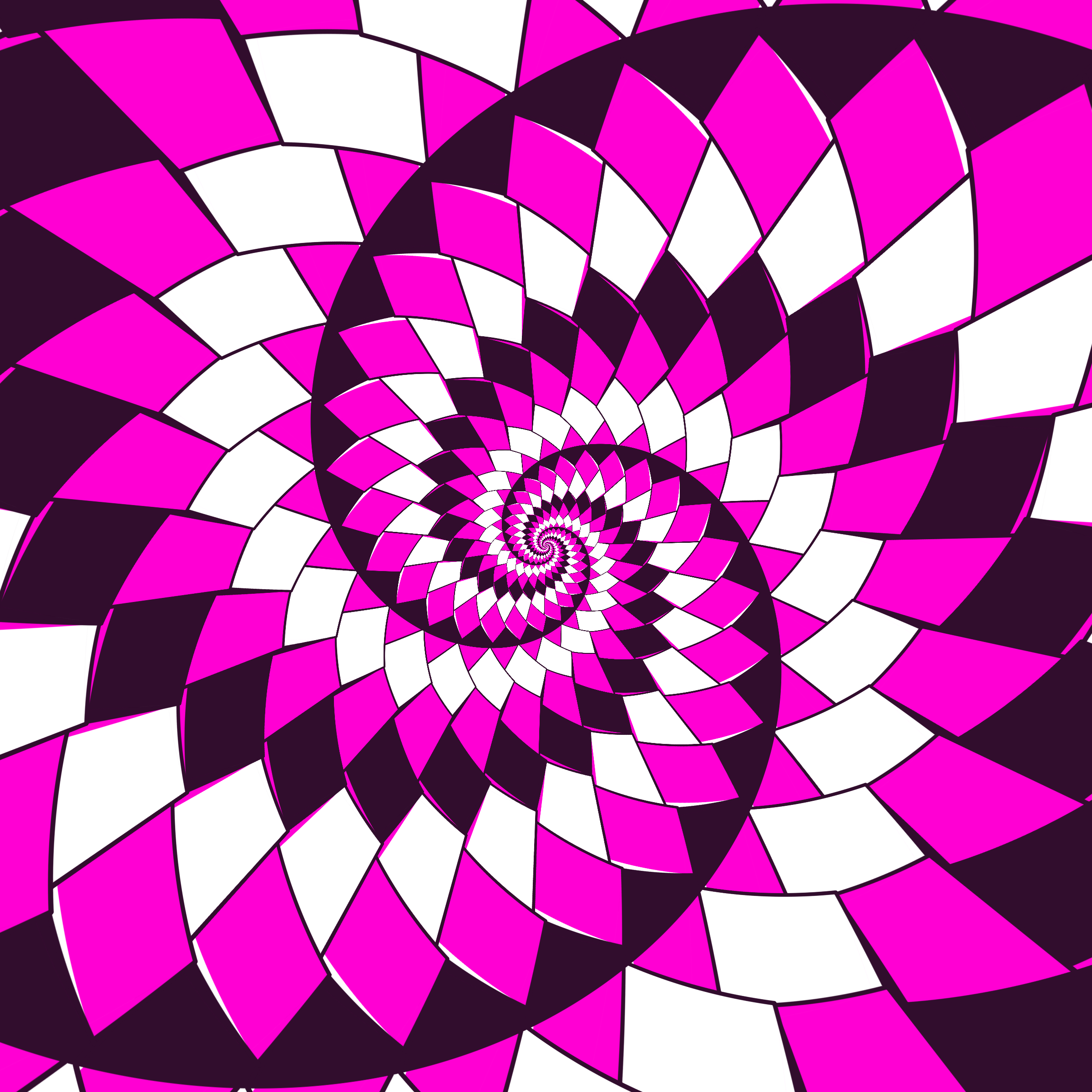 Escher-style tiling of a plane, gone wrong. Each image spins hash-driven colors, shapes, and symmetries into infinity. Fly through the spiral as it morphs between beauty and madness. Keys: F = Fly through/back, D = Distort on/off, Esc = Stop, S = Save image.