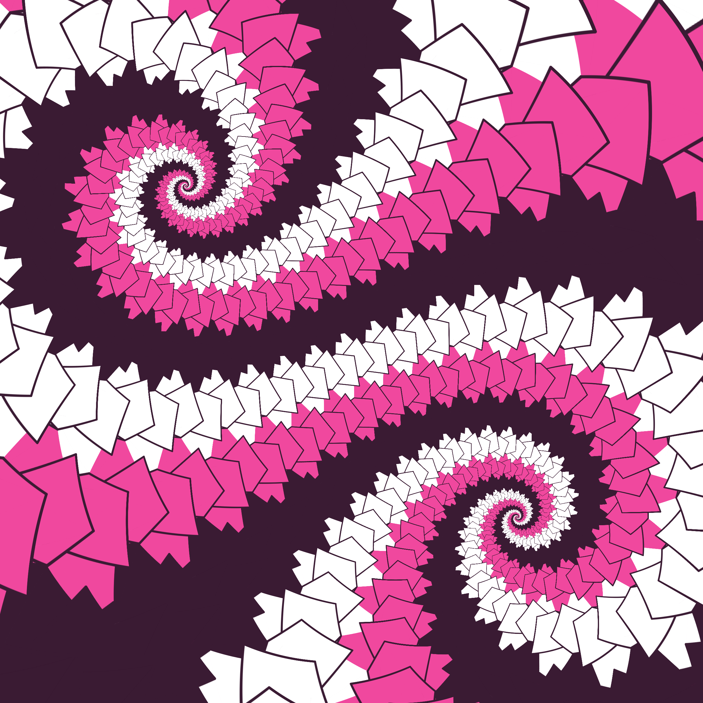 Escher-style tiling of a plane, gone wrong. Each image spins hash-driven colors, shapes, and symmetries into infinity. Fly through the spiral as it morphs between beauty and madness. Keys: F = Fly through/back, D = Distort on/off, Esc = Stop, S = Save image.