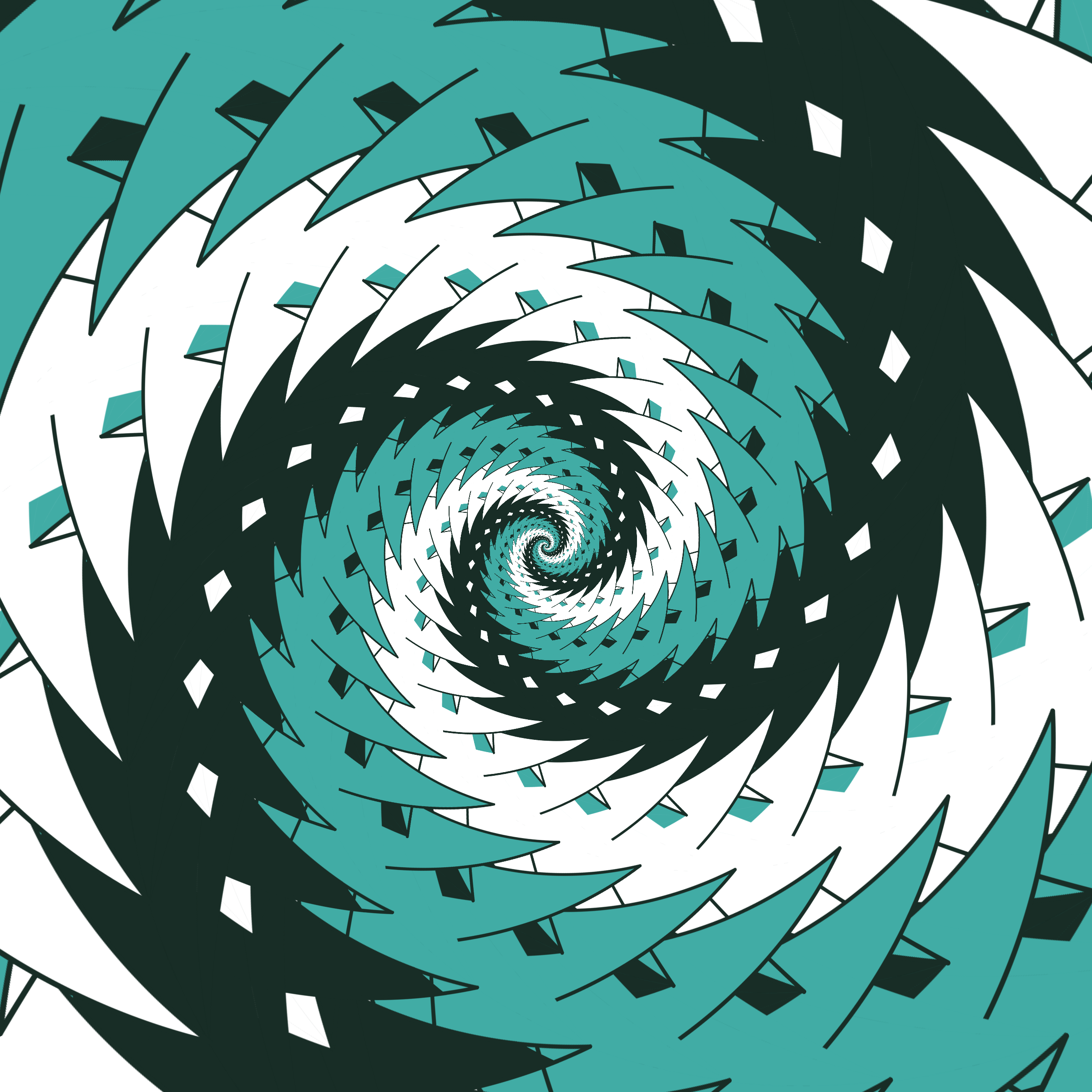 Escher-style tiling of a plane, gone wrong. Each image spins hash-driven colors, shapes, and symmetries into infinity. Fly through the spiral as it morphs between beauty and madness. Keys: F = Fly through/back, D = Distort on/off, Esc = Stop, S = Save image.