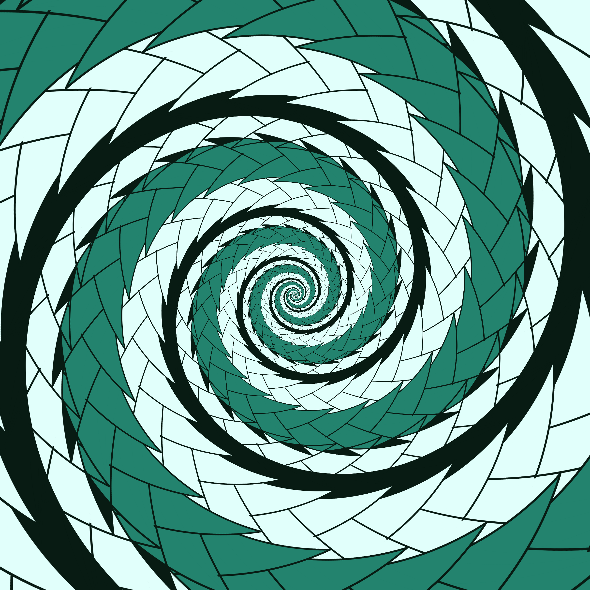 Escher-style tiling of a plane, gone wrong. Each image spins hash-driven colors, shapes, and symmetries into infinity. Fly through the spiral as it morphs between beauty and madness. Keys: F = Fly through/back, D = Distort on/off, Esc = Stop, S = Save image.