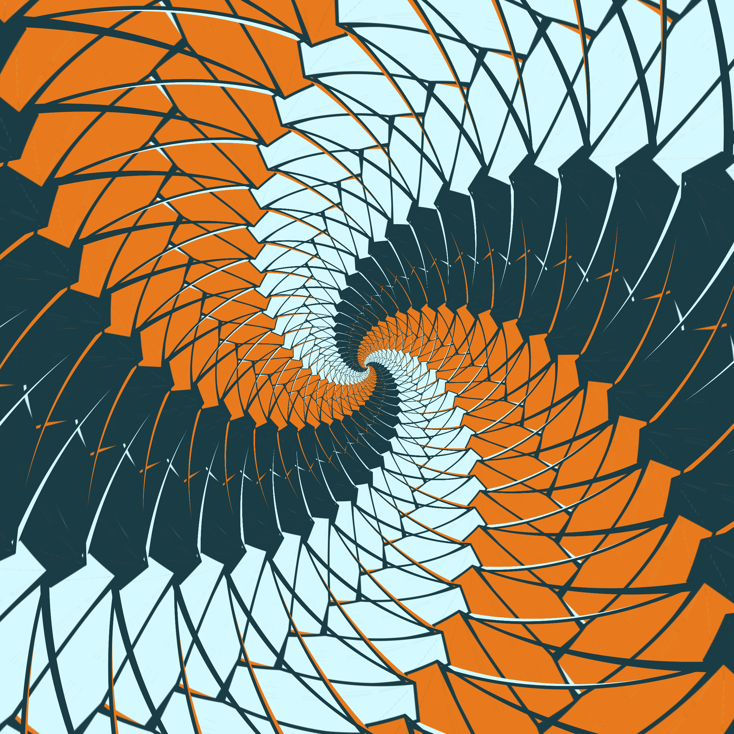 Escher-style tiling of a plane, gone wrong. Each image spins hash-driven colors, shapes, and symmetries into infinity. Fly through the spiral as it morphs between beauty and madness. Keys: F = Fly through/back, D = Distort on/off, Esc = Stop, S = Save image.