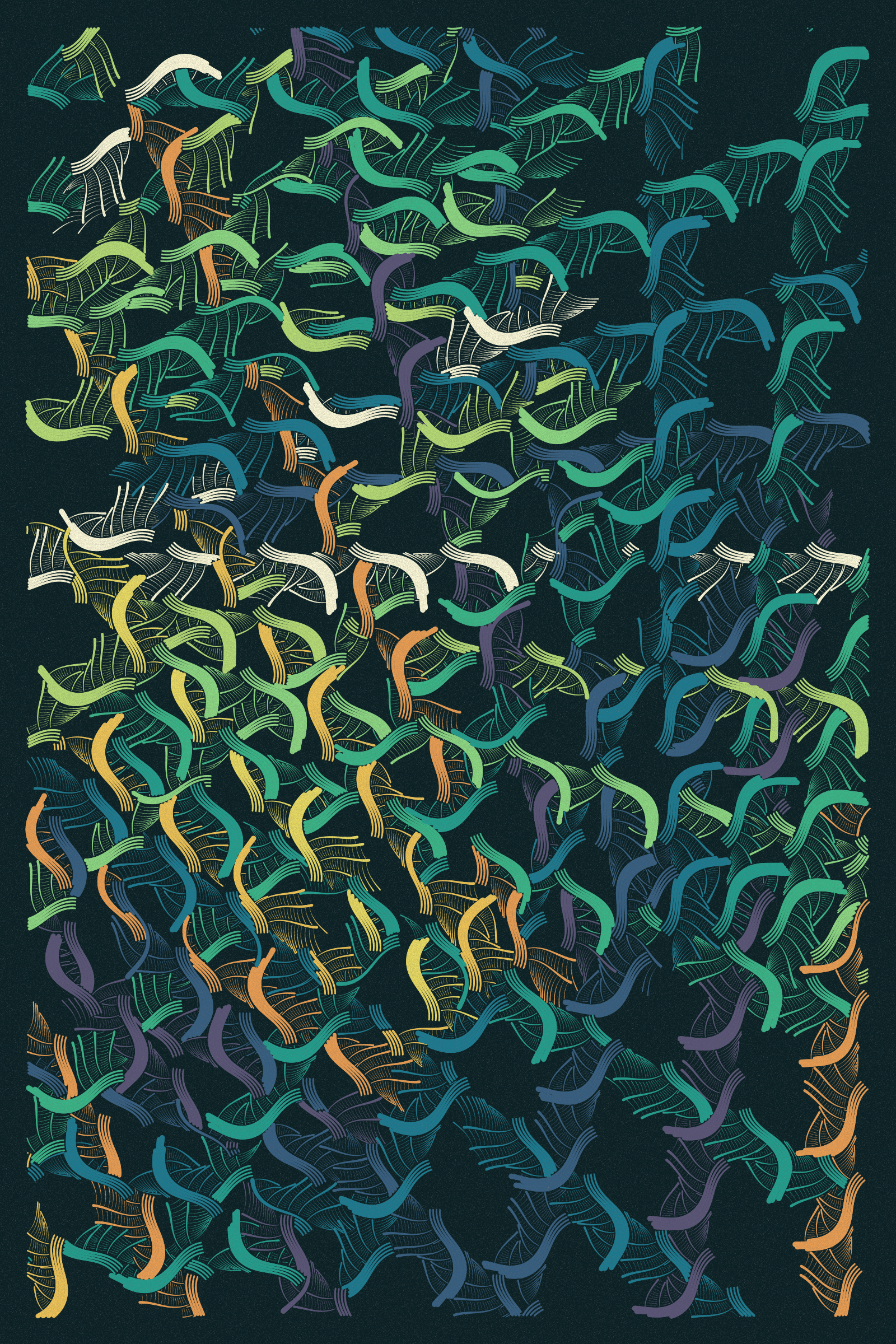 This collection includes a very large number of possible variations. Some properties are specific to the agents and allow to define their rules, colors, number of children, angle… Many parameters influence the initial position and direction of the agents, palettes… Each combinaison creates a very unique output.