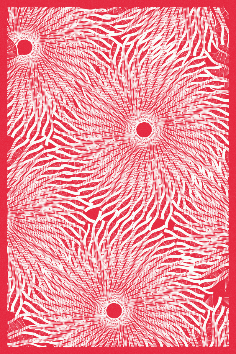 From a distance, an Intricada piece may look like intersecting circles, geometric patterns, confetti, a perspective design... When you get closer, you can see that these shapes are composed of multitudes of agent trajectories. Finally, if we get even closer, we can see that these trajectories are composed of points (several hundreds of thousands per output).