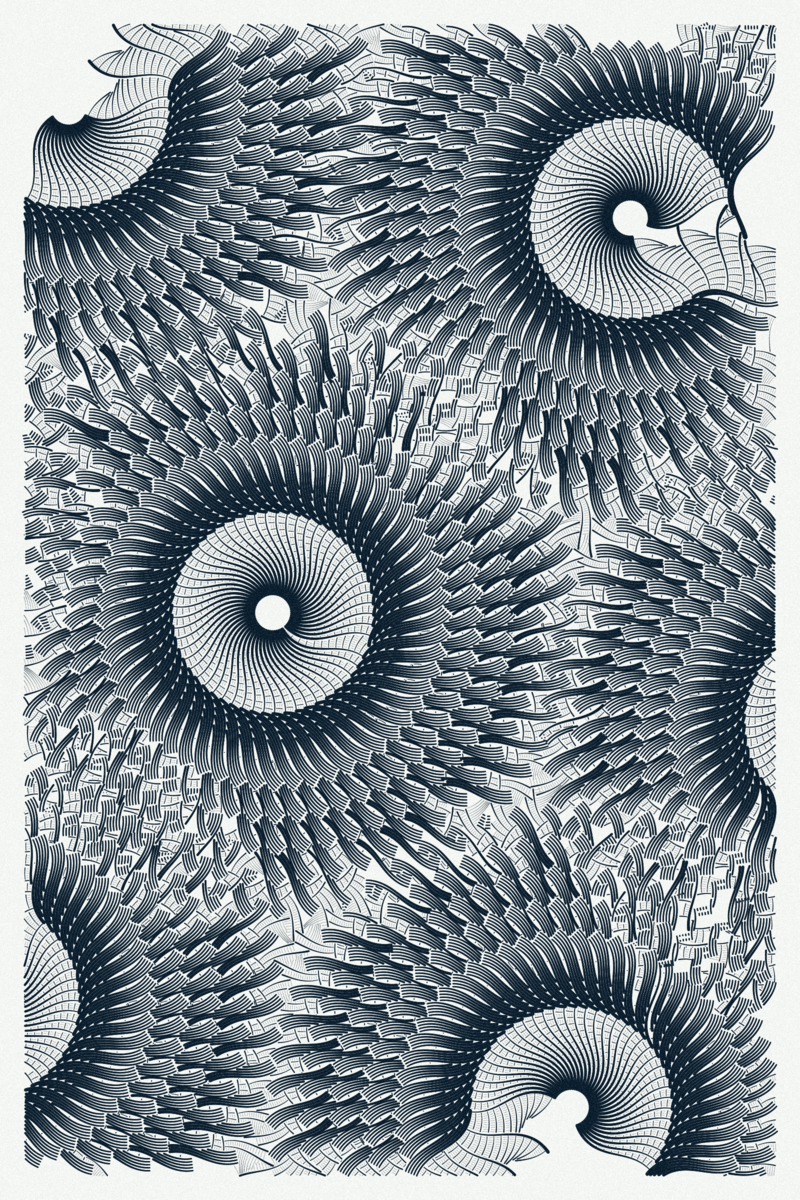 From a distance, an Intricada piece may look like intersecting circles, geometric patterns, confetti, a perspective design... When you get closer, you can see that these shapes are composed of multitudes of agent trajectories. Finally, if we get even closer, we can see that these trajectories are composed of points (several hundreds of thousands per output).