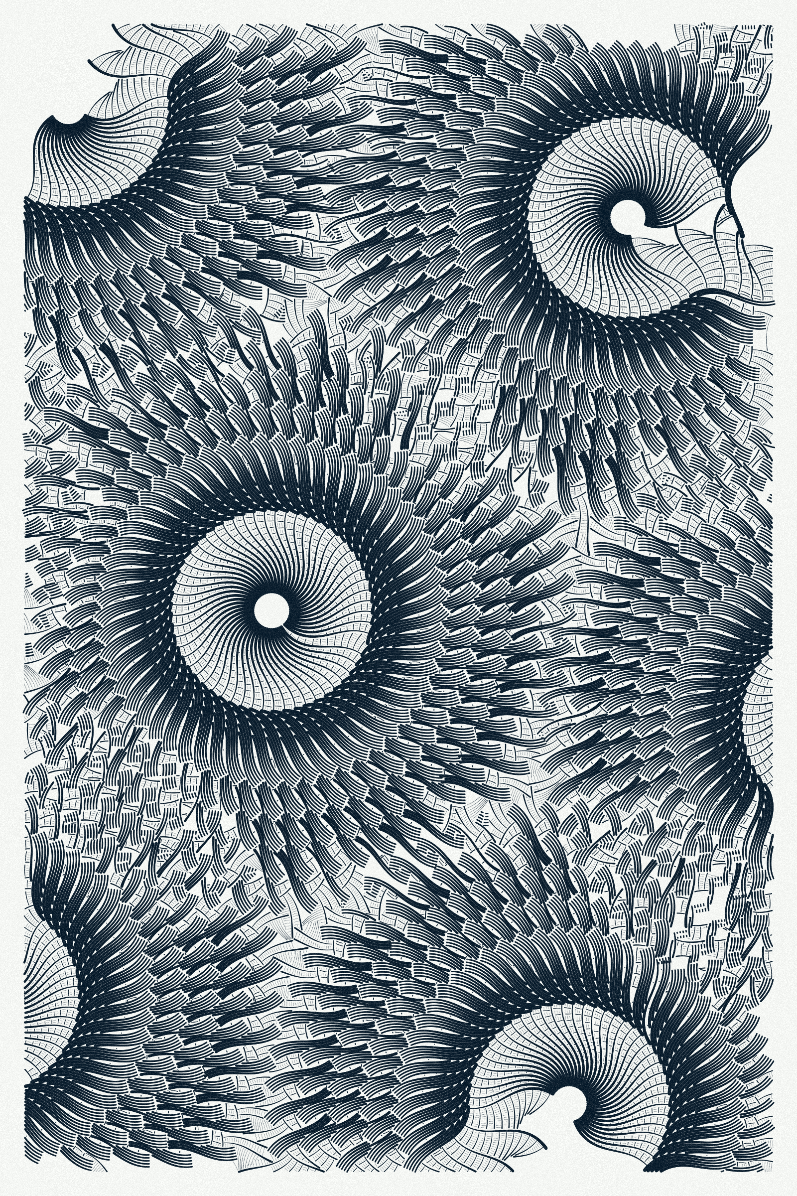 Intricada is created with autonomous agents drawing very small dots and following simple rules, positioned according to geometrical patterns. I’ve designed Intricada like a simulation, giving initial conditions and see what comes out of it. Each piece is the result of thousands of unpredictable consequences.