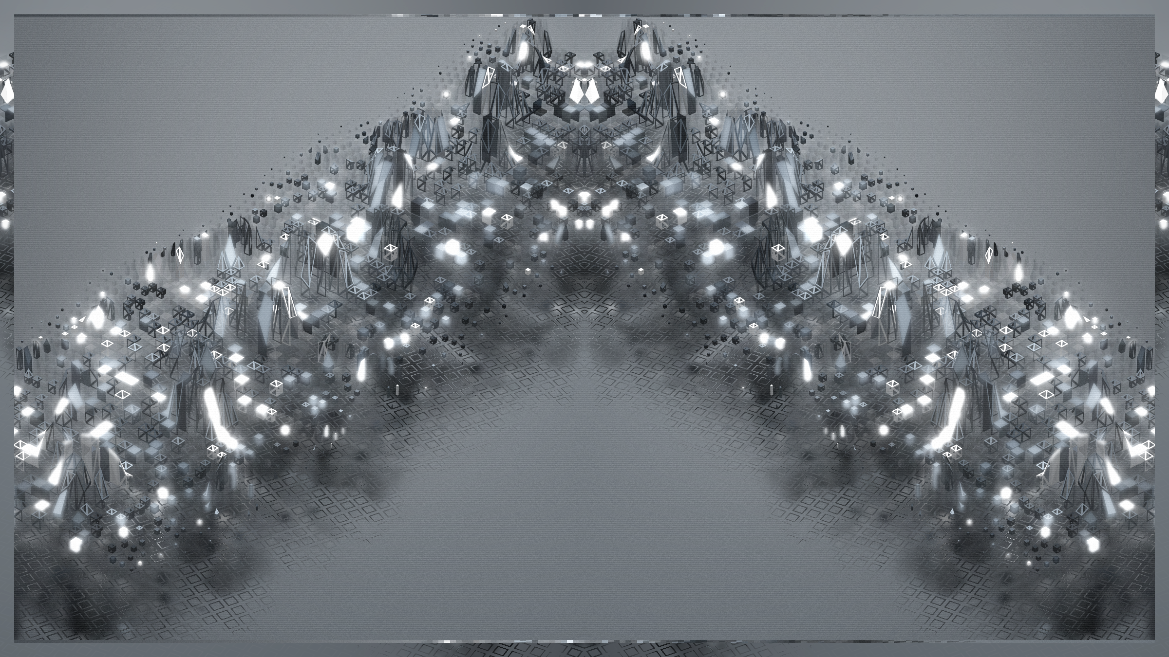 Random and anarchy, chaos and structurality. Jiometory No Compute is a living motion experimental study, a contemplative geometry organism that lives now and forever. Each individual units movement contributes and flows into a generative path for a greater purpose. Together they try to achieve a symbiosis, although an « ideal » computer program is very relative. Exploring domains of definitions and warping an input data-set leads to unexpected behaviors, sometimes surprising, often fascinating. Interactions : Zoom-in / Zoom-out / Drag left and right / Best view in full-screen.