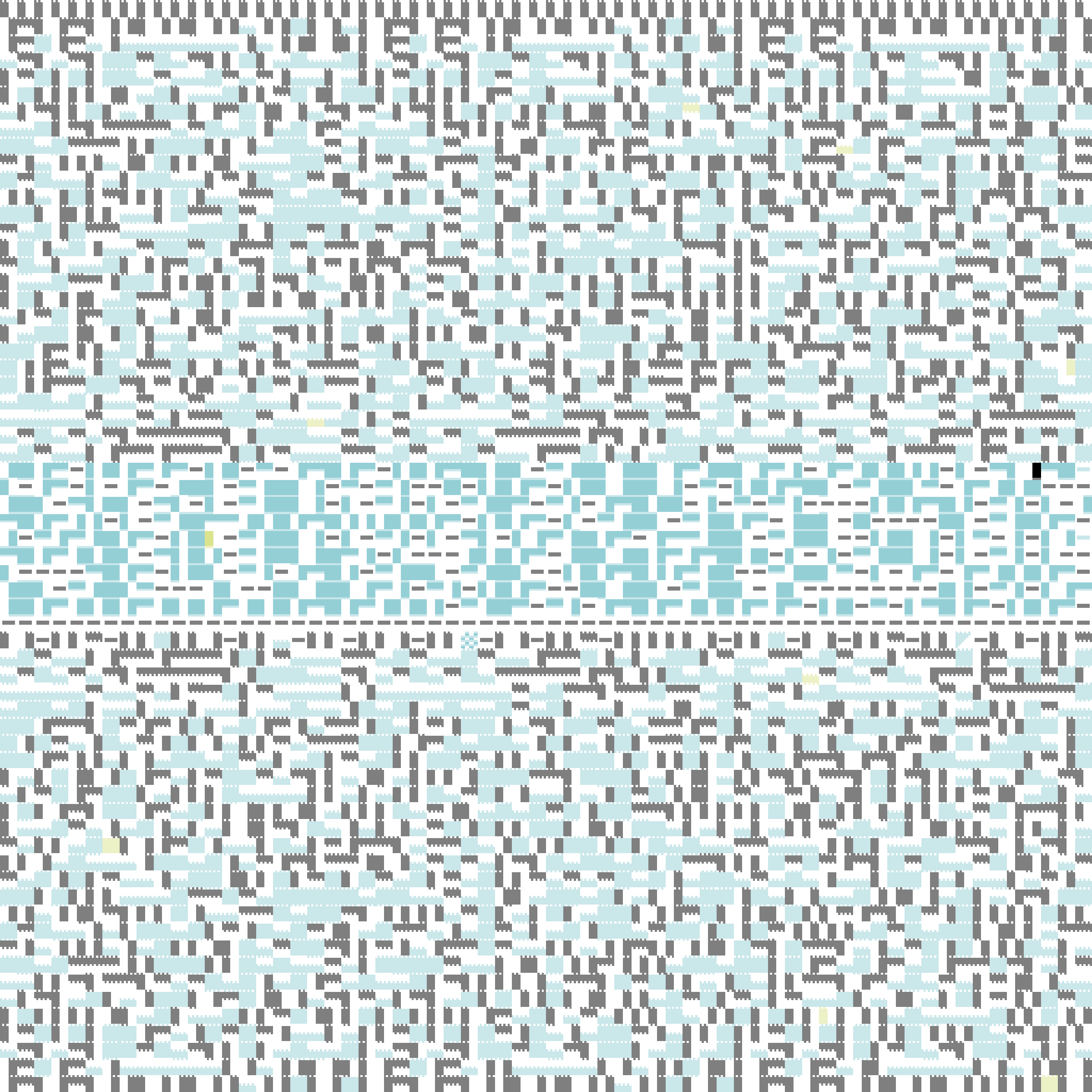 **KERNELS** is the mechanical interplay of several Finite-State Machines that form together an elaborate visual system. At the core of the system lives the Kernel (or a version of it), inviting you to stick around and forget about everything, while it is doing all of the computational work for you. The underlying grid of the visual system is both the output and the raw data on which a Finite-State Machine is doing calculations on a per cell basis. The Kernel is telling you, that generating outputs is as easy as 1 + 1.