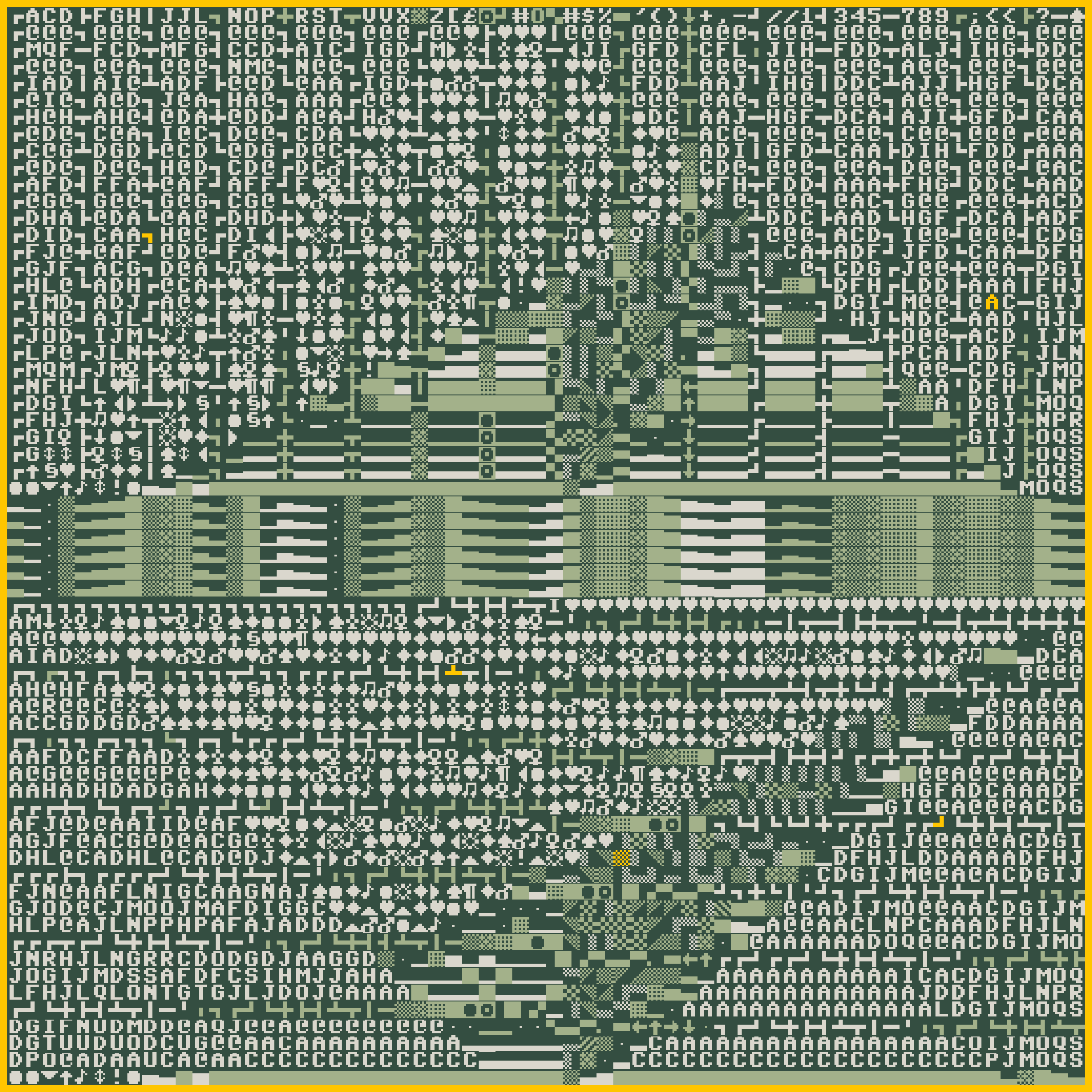 The visual elements are derived from the 80s computer era and are ought to evoke a warm feeling of completeness and simplicity. On a 64×64 grid a variety of glyphs find their home within the single cells, shaped by different algorithms and placed into this world by one of the many color palettes. In total there are 64 custom color palettes with the ability to switch to a more 'rare' inverted configuration.