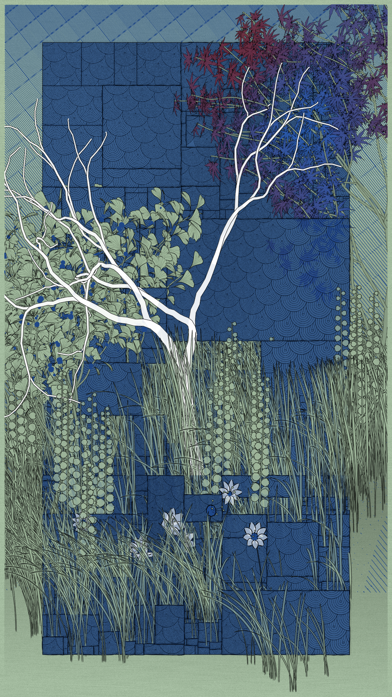 How can one create a work inspired by a city where one has never set foot? Moreover, a place on the other side of the world, whose history and cultural richness are of such dizzying density? I quickly realized that my work could only be imagined, dreamed, imbued with my Western culture, tinged with my distant prejudices. I worked with a visual approach above all, around a few chosen colors, representative tree species, and some clichéd symbols: for example, the composition is organized around 3 abstract shapes, including the circle, directly inspired by the rising sun on the flag, the rectangular shape of a kakemono, or a cityscape.