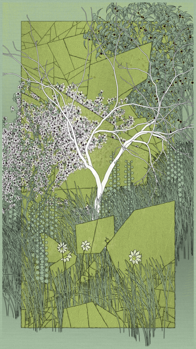How can one create a work inspired by a city where one has never set foot? Moreover, a place on the other side of the world, whose history and cultural richness are of such dizzying density? I quickly realized that my work could only be imagined, dreamed, imbued with my Western culture, tinged with my distant prejudices. I worked with a visual approach above all, around a few chosen colors, representative tree species, and some clichéd symbols: for example, the composition is organized around 3 abstract shapes, including the circle, directly inspired by the rising sun on the flag, the rectangular shape of a kakemono, or a cityscape.