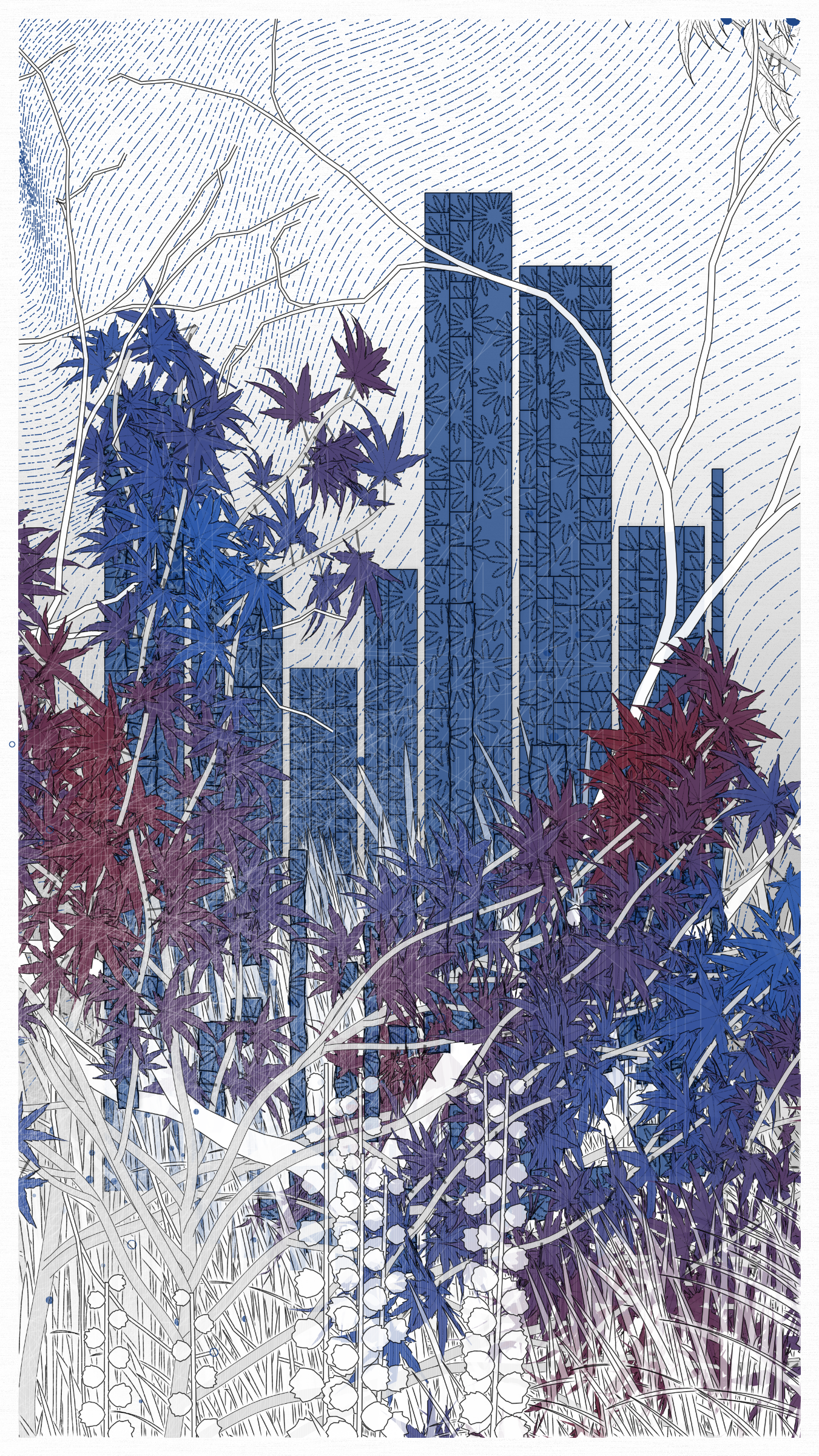 How can one create a work inspired by a city where one has never set foot? Moreover, a place on the other side of the world, whose history and cultural richness are of such dizzying density? I quickly realized that my work could only be imagined, dreamed, imbued with my Western culture, tinged with my distant prejudices. I worked with a visual approach above all, around a few chosen colors, representative tree species, and some clichéd symbols: for example, the composition is organized around 3 abstract shapes, including the circle, directly inspired by the rising sun on the flag, the rectangular shape of a kakemono, or a cityscape.