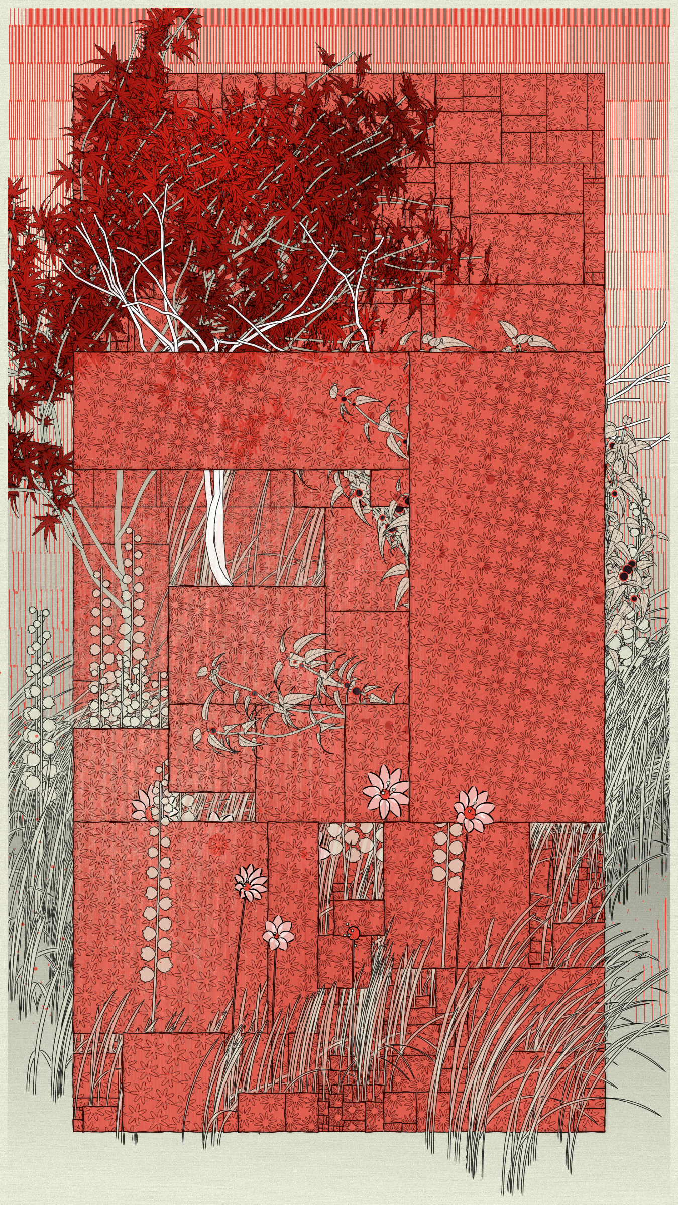 How can one create a work inspired by a city where one has never set foot? Moreover, a place on the other side of the world, whose history and cultural richness are of such dizzying density? I quickly realized that my work could only be imagined, dreamed, imbued with my Western culture, tinged with my distant prejudices. I worked with a visual approach above all, around a few chosen colors, representative tree species, and some clichéd symbols: for example, the composition is organized around 3 abstract shapes, including the circle, directly inspired by the rising sun on the flag, the rectangular shape of a kakemono, or a cityscape.