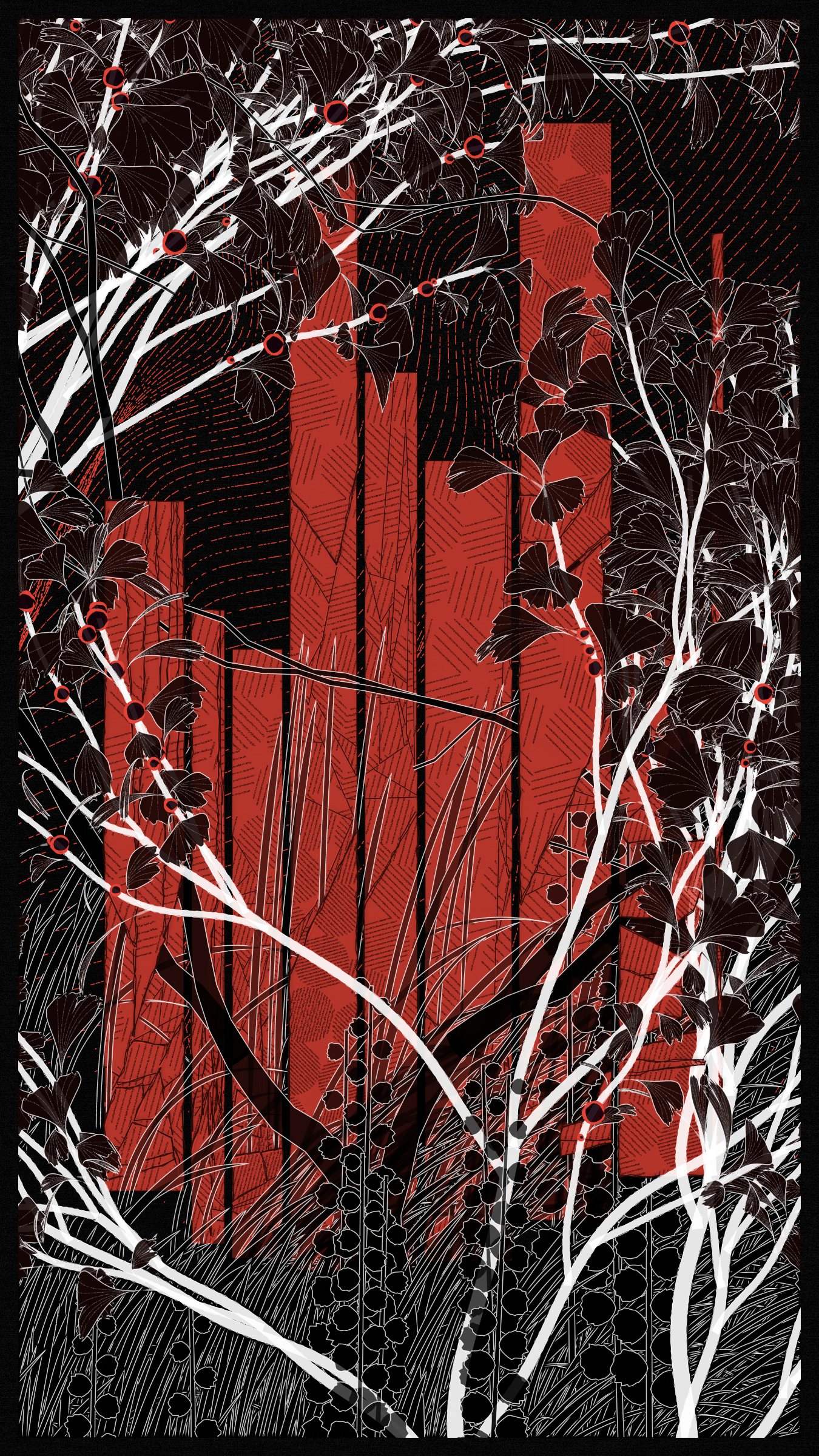 How can one create a work inspired by a city where one has never set foot? Moreover, a place on the other side of the world, whose history and cultural richness are of such dizzying density? I quickly realized that my work could only be imagined, dreamed, imbued with my Western culture, tinged with my distant prejudices. I worked with a visual approach above all, around a few chosen colors, representative tree species, and some clichéd symbols: for example, the composition is organized around 3 abstract shapes, including the circle, directly inspired by the rising sun on the flag, the rectangular shape of a kakemono, or a cityscape.