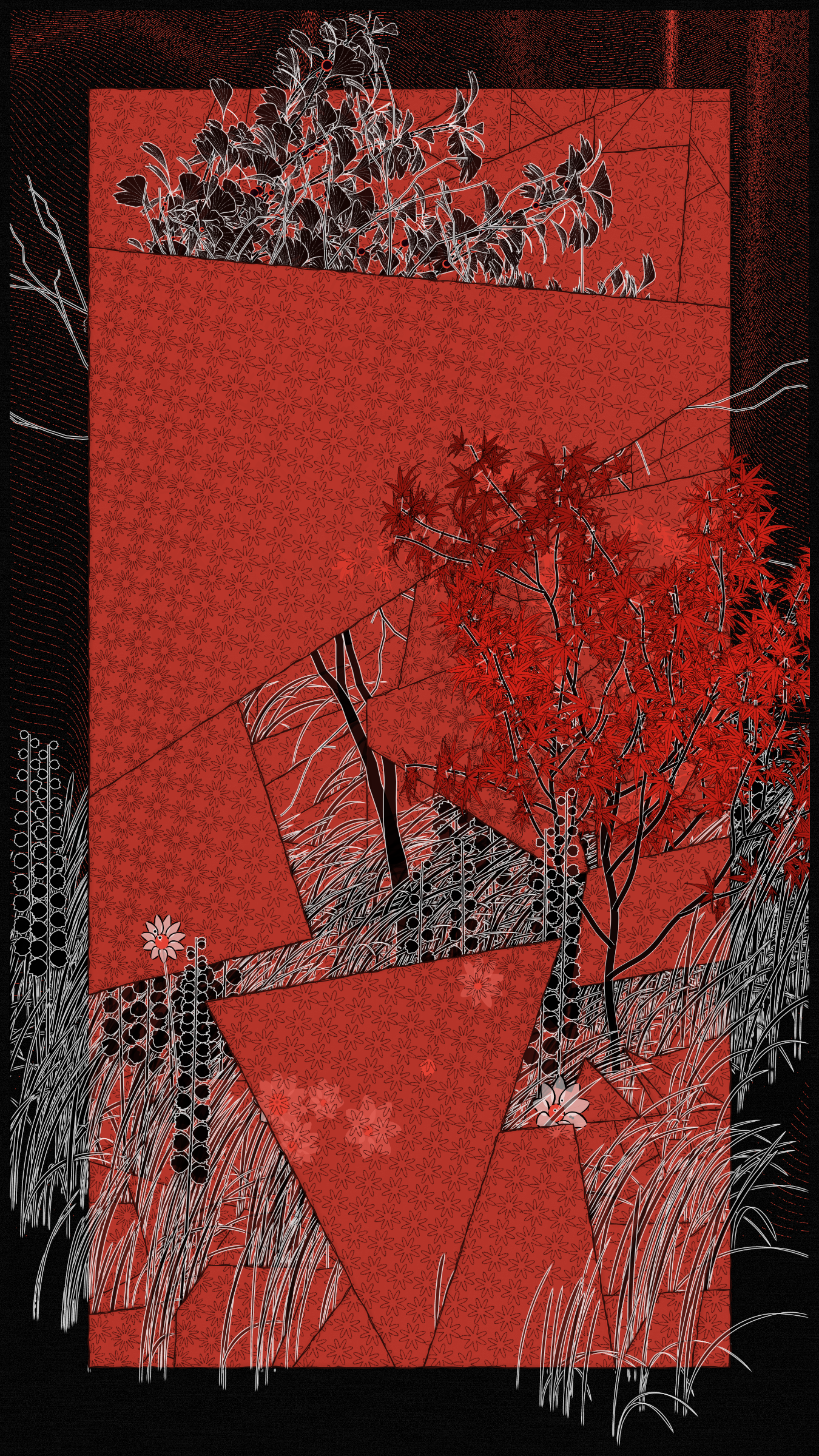 How can one create a work inspired by a city where one has never set foot? Moreover, a place on the other side of the world, whose history and cultural richness are of such dizzying density? I quickly realized that my work could only be imagined, dreamed, imbued with my Western culture, tinged with my distant prejudices. I worked with a visual approach above all, around a few chosen colors, representative tree species, and some clichéd symbols: for example, the composition is organized around 3 abstract shapes, including the circle, directly inspired by the rising sun on the flag, the rectangular shape of a kakemono, or a cityscape.
