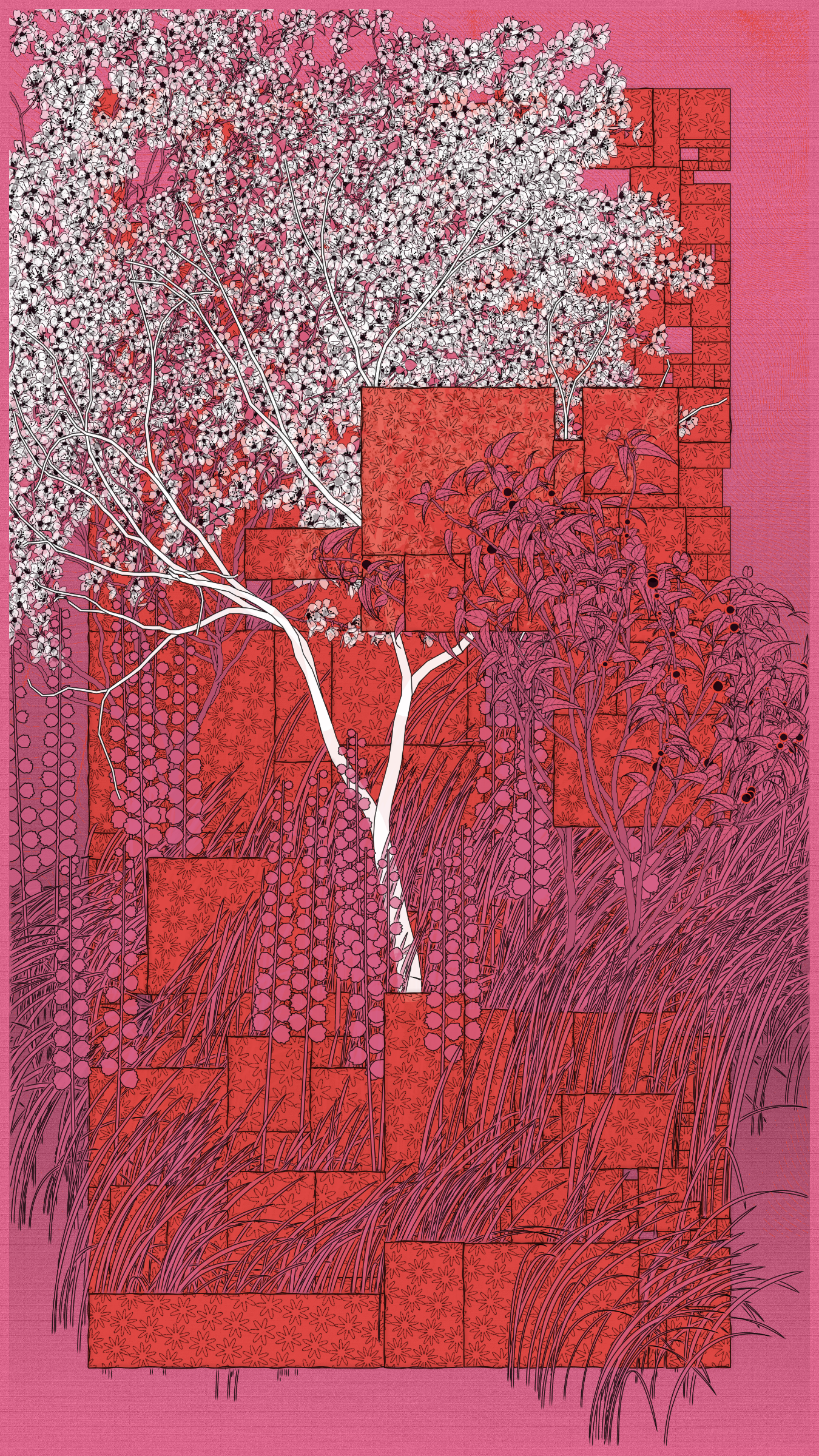 How can one create a work inspired by a city where one has never set foot? Moreover, a place on the other side of the world, whose history and cultural richness are of such dizzying density? I quickly realized that my work could only be imagined, dreamed, imbued with my Western culture, tinged with my distant prejudices. I worked with a visual approach above all, around a few chosen colors, representative tree species, and some clichéd symbols: for example, the composition is organized around 3 abstract shapes, including the circle, directly inspired by the rising sun on the flag, the rectangular shape of a kakemono, or a cityscape.