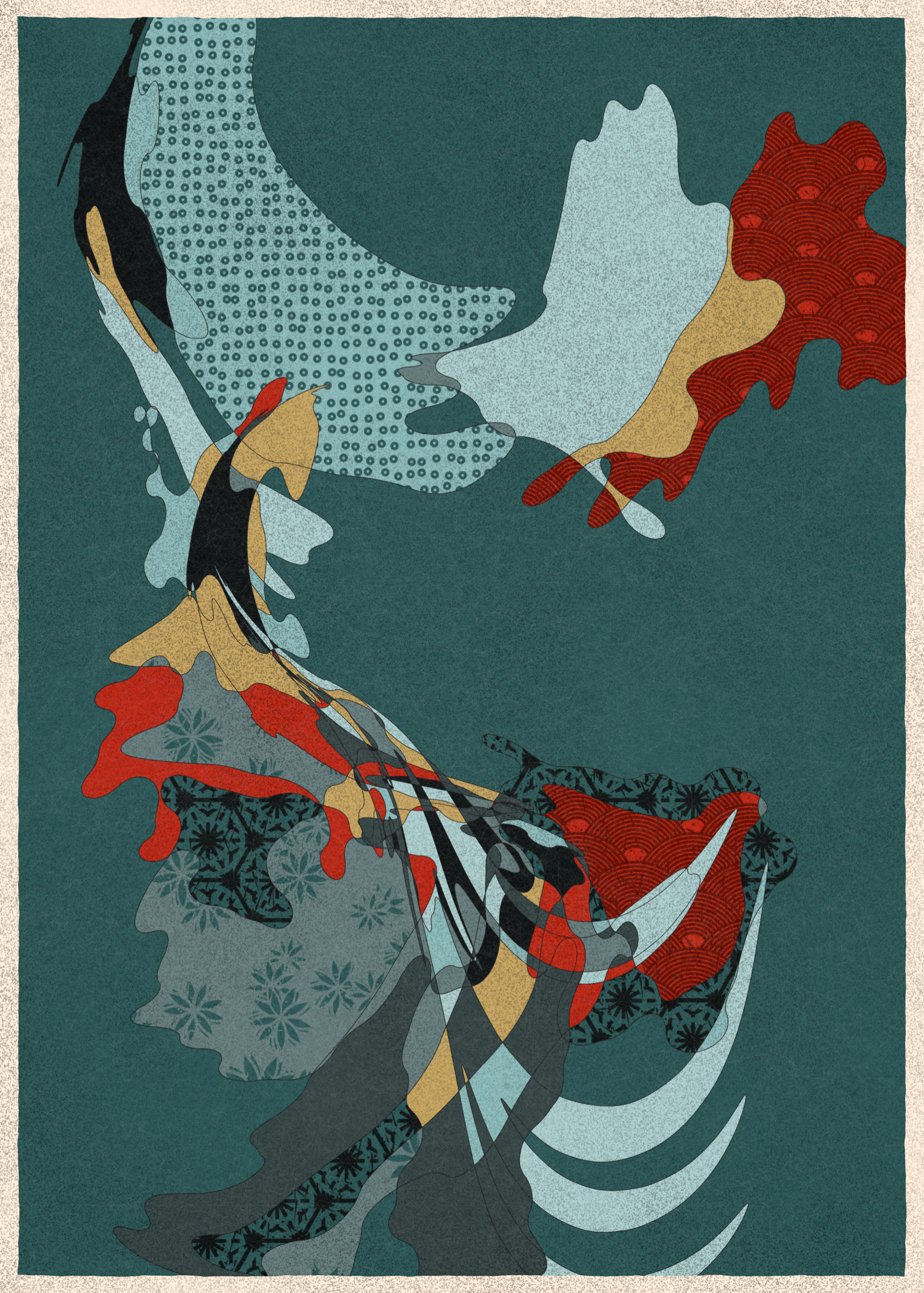 Memories of Qilin is inspired by traditional East Asian art. It channels the sense of movement and fluidity found in classical Chinese brushwork, while drawing from the colors, patterns, and forms of ukiyo-e woodblock prints.