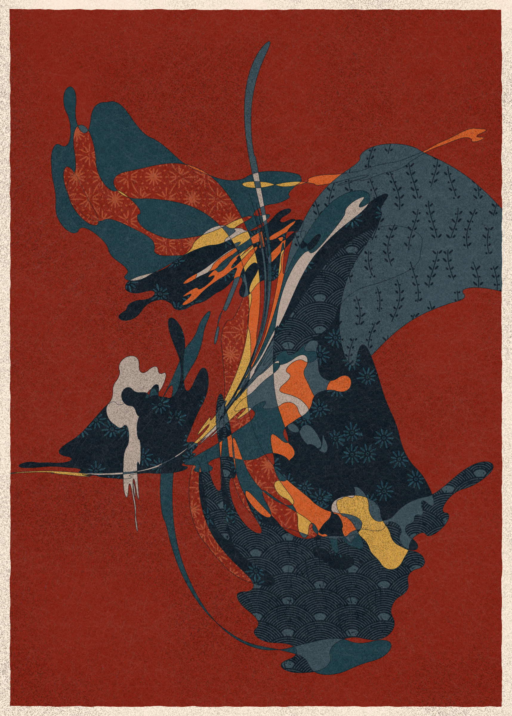 Memories of Qilin is inspired by traditional East Asian art. It channels the sense of movement and fluidity found in classical Chinese brushwork, while drawing from the colors, patterns, and forms of ukiyo-e woodblock prints.