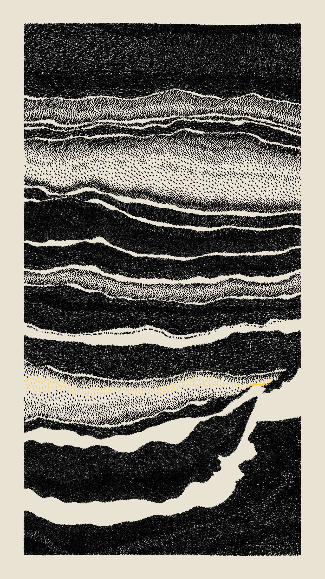 Stratified landforms constructed from many small strokes of colour. The hash of each token describes a coordinate within a multidimensional generative space, locating a unique composition that lies along one of many possible longitudes.