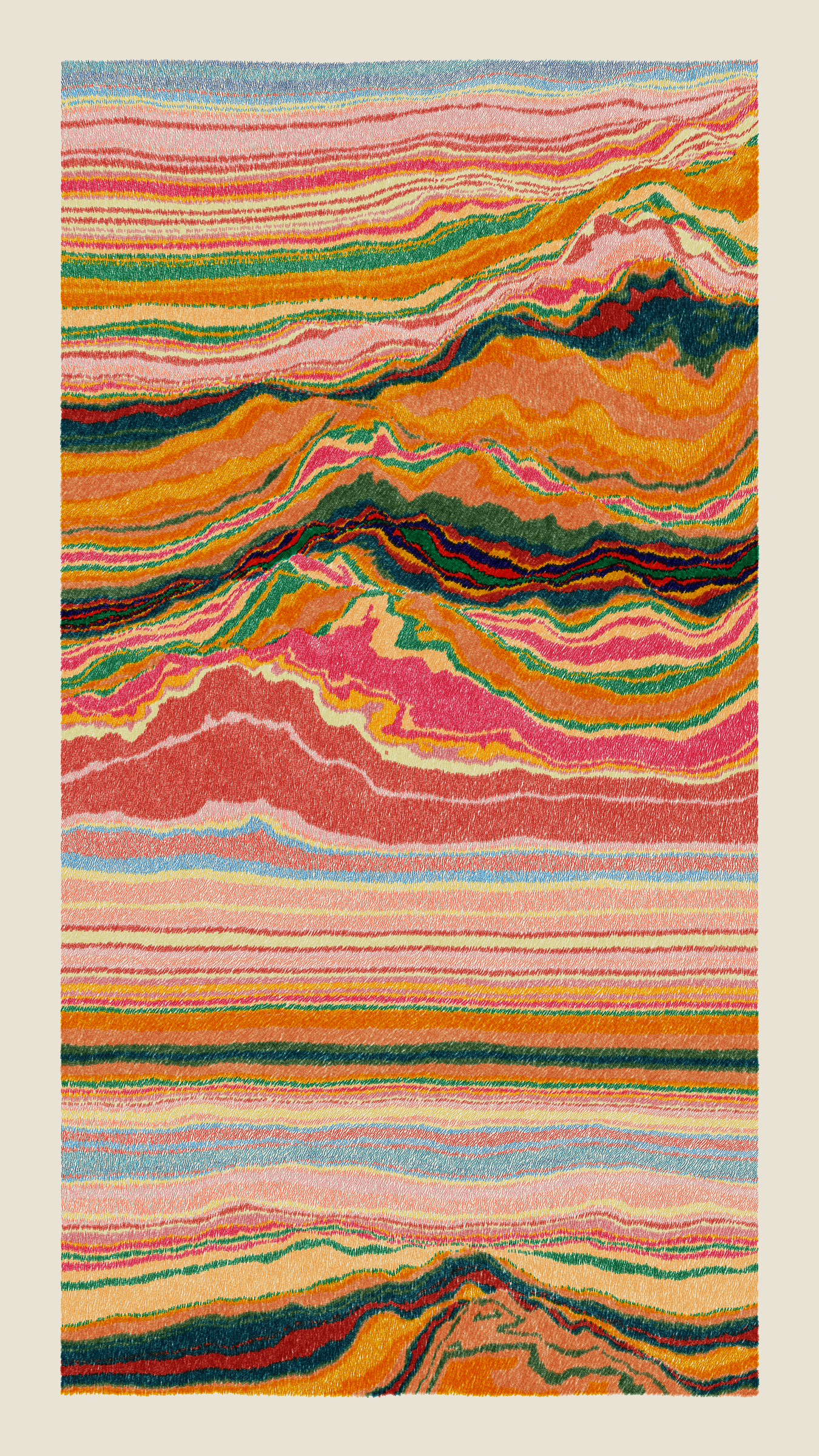 Stratified landforms constructed from many small strokes of colour. The hash of each token describes a coordinate within a multidimensional generative space, locating a unique composition that lies along one of many possible longitudes.