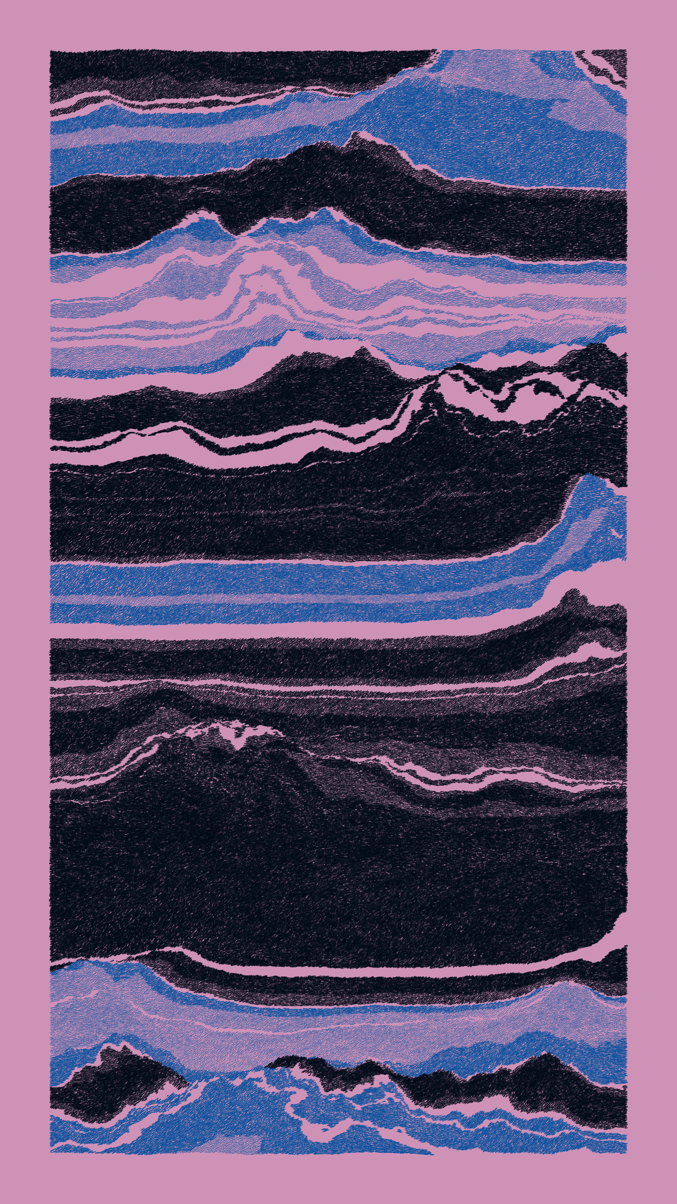 Stratified landforms constructed from many small strokes of colour. The hash of each token describes a coordinate within a multidimensional generative space, locating a unique composition that lies along one of many possible longitudes.