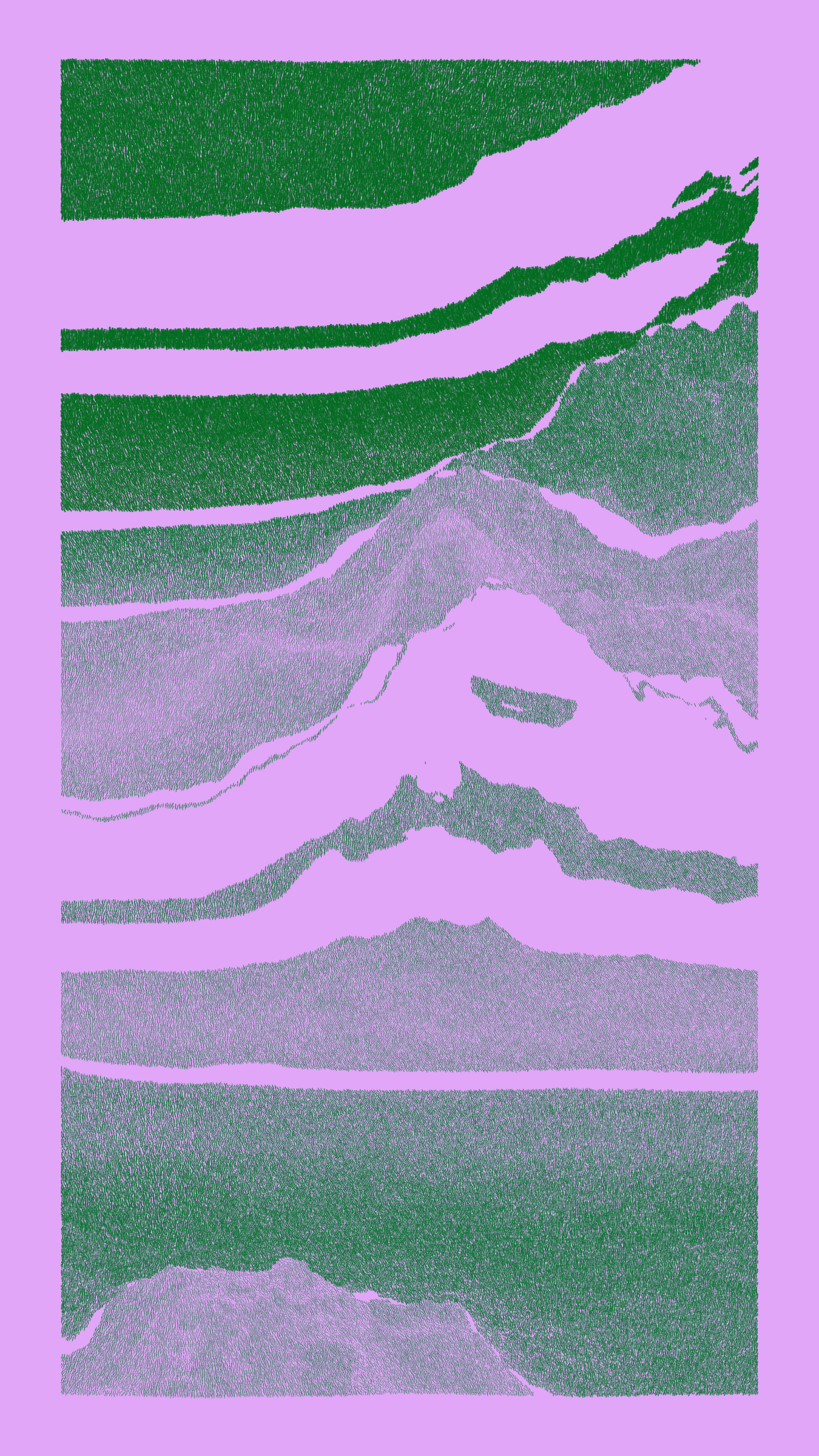 Stratified landforms constructed from many small strokes of colour. The hash of each token describes a coordinate within a multidimensional generative space, locating a unique composition that lies along one of many possible longitudes.