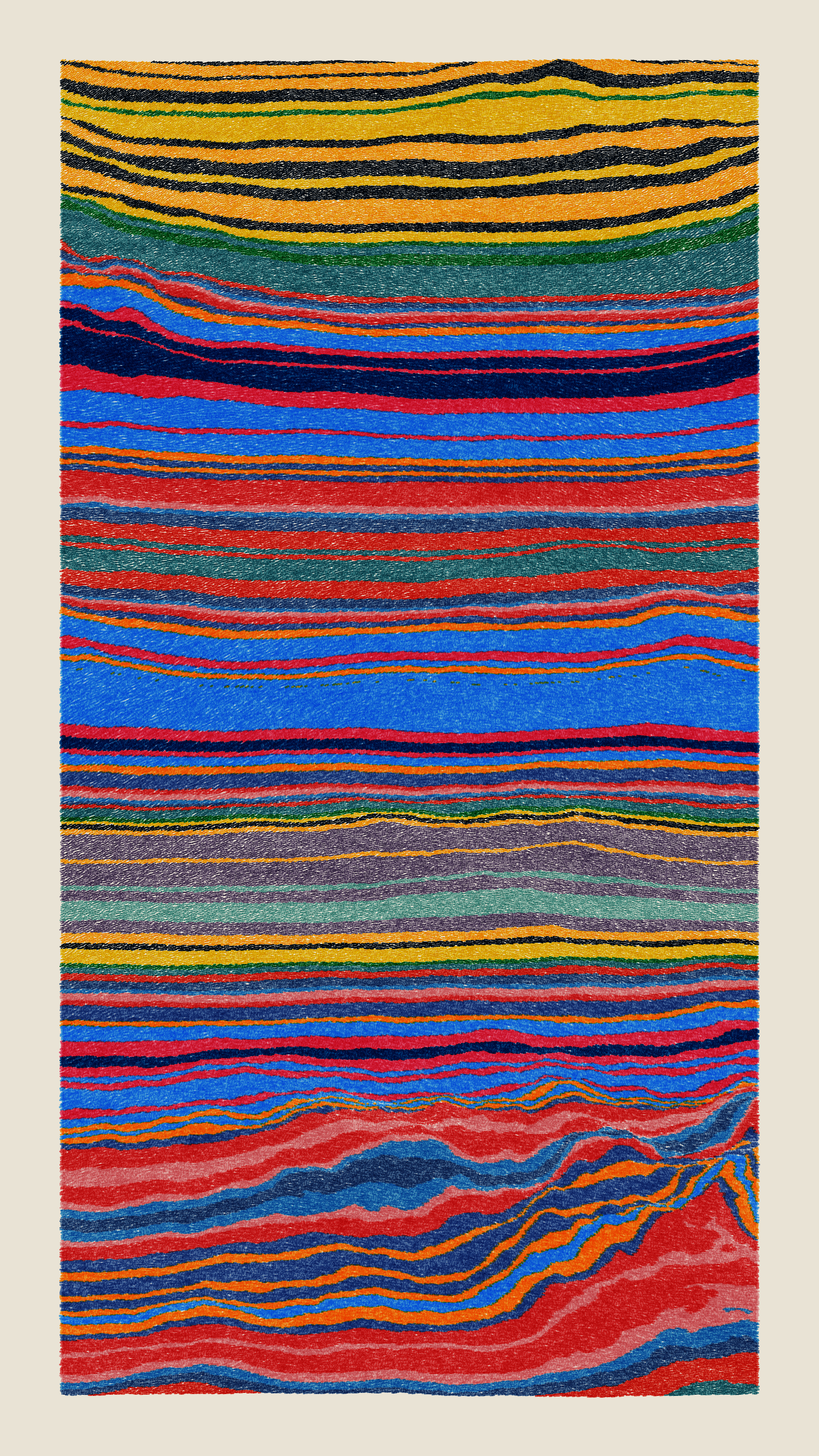 Stratified landforms constructed from many small strokes of colour. The hash of each token describes a coordinate within a multidimensional generative space, locating a unique composition that lies along one of many possible longitudes.