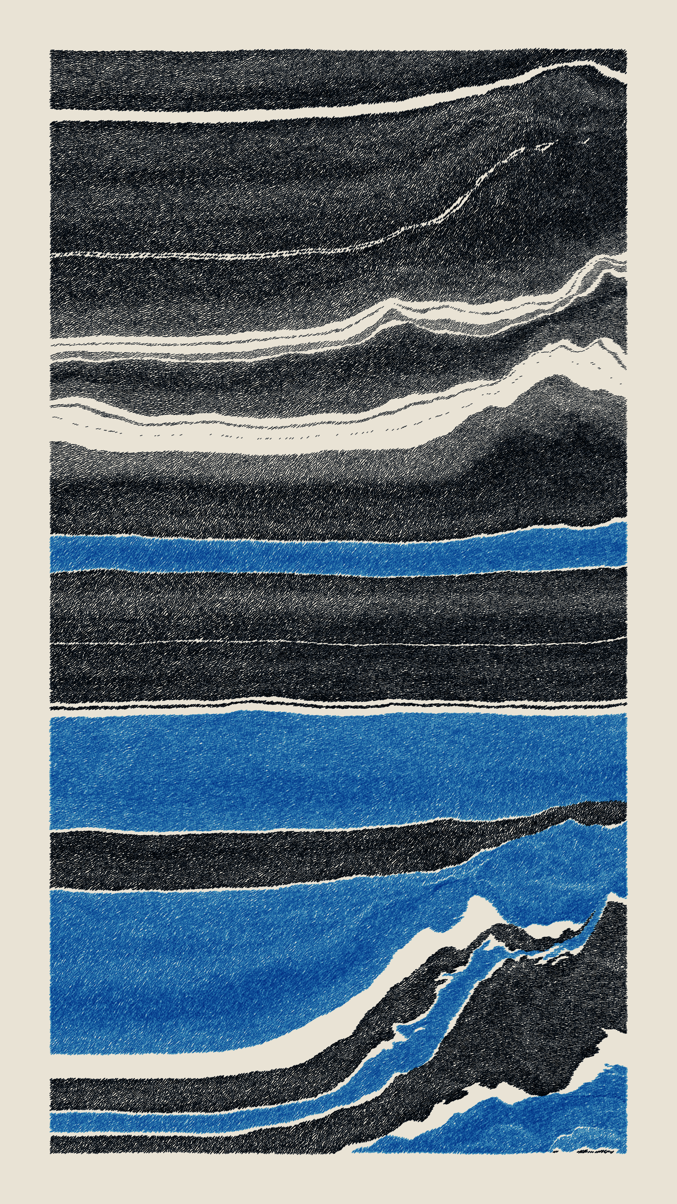 Stratified landforms constructed from many small strokes of colour. The hash of each token describes a coordinate within a multidimensional generative space, locating a unique composition that lies along one of many possible longitudes.