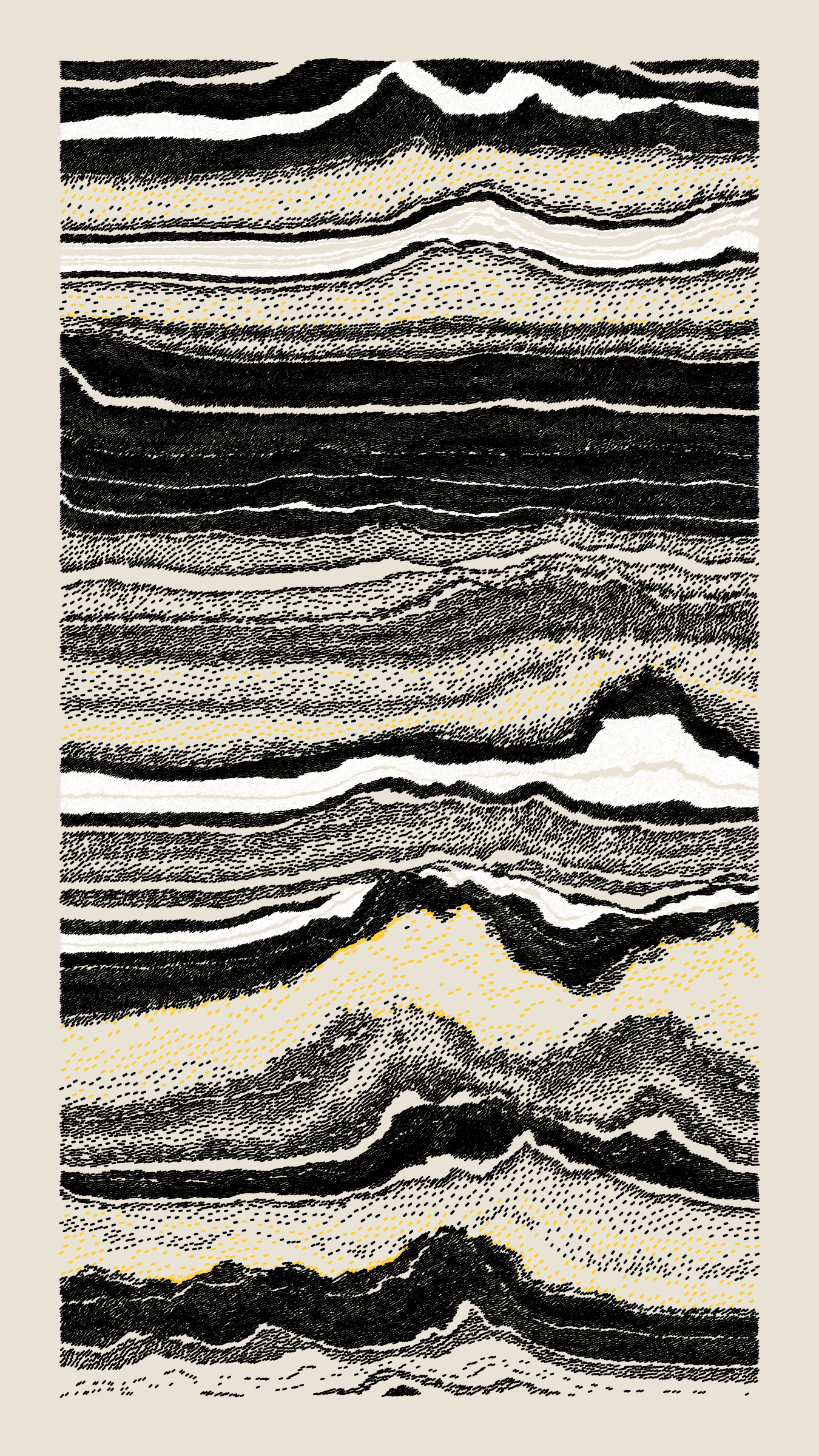 Stratified landforms constructed from many small strokes of colour. The hash of each token describes a coordinate within a multidimensional generative space, locating a unique composition that lies along one of many possible longitudes.